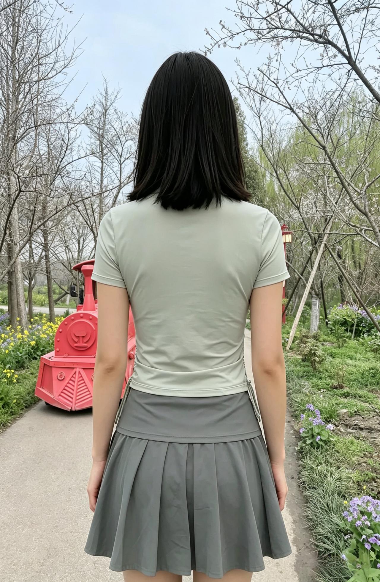 青丝如瀑映花繁,背影亭亭立春园。