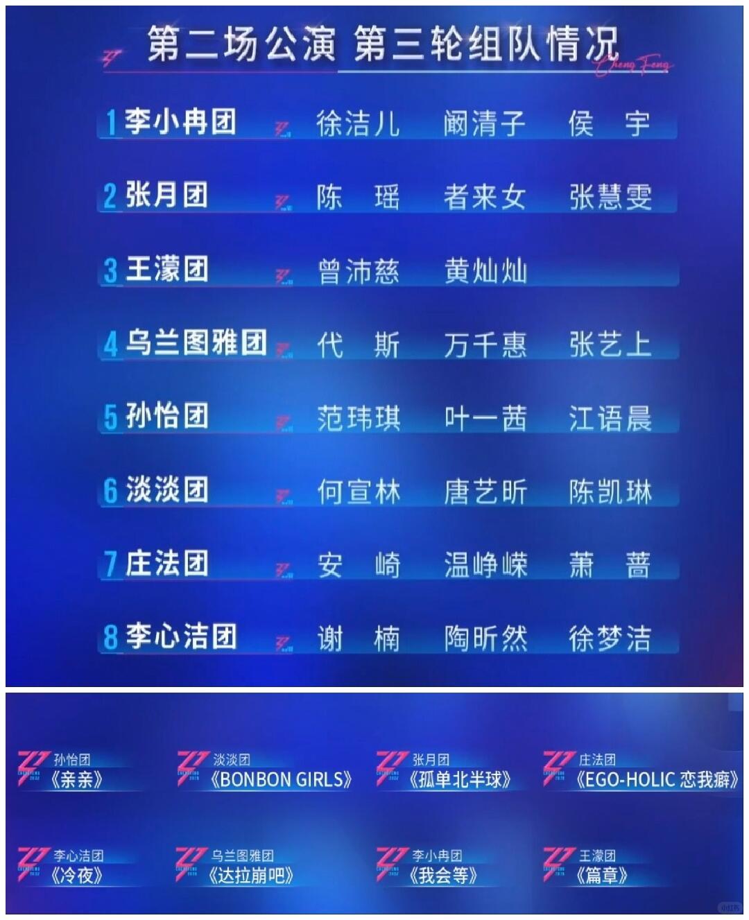 乘风二公组队及选曲情况队长:李小冉、张月、王濛、乌兰图雅、孙怡、淡淡、庄法、李心洁