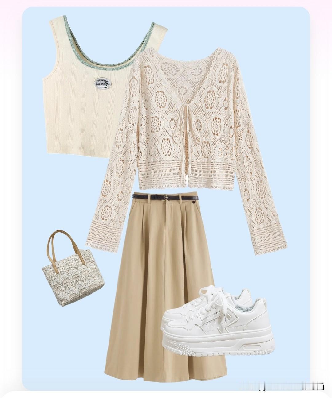 穿搭公式:短款针织开衫+高腰A字半身裙+小白鞋