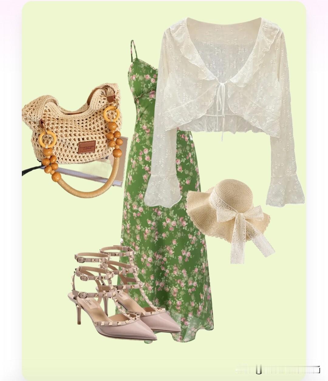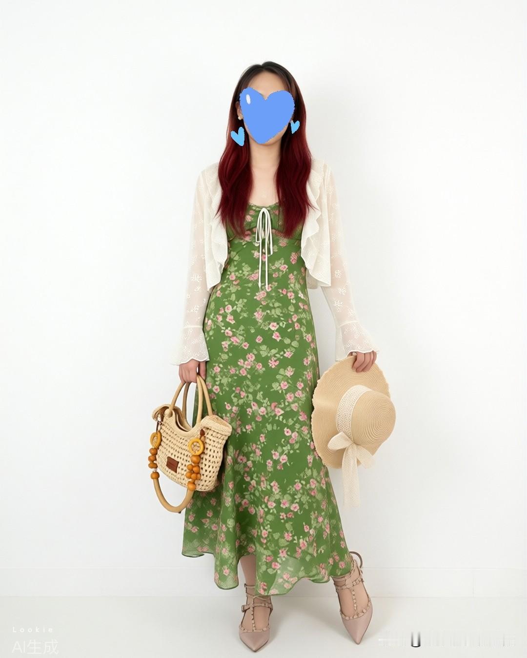 穿搭公式:碎花吊带裙+白色防晒开衫+凉鞋