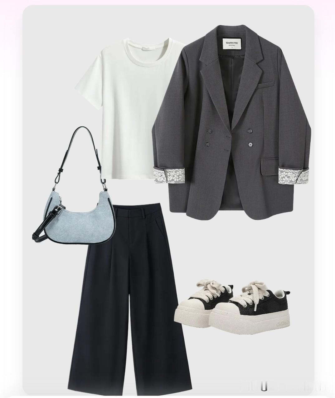 穿搭公式:灰色西装外套+白色内搭+黑色直筒裤+帆布鞋