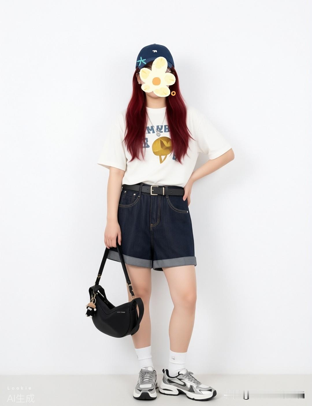 穿搭公式:oversize白T+高腰牛仔短裤+老爹鞋