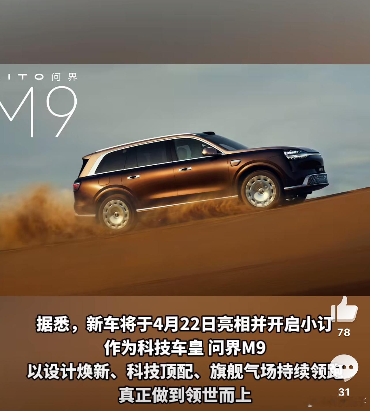 4月22就开启预售,那应该5月份就开始上市交付,看来豪华旗舰SUV又要变天了!怎么办新M9实在是太诱人了,我要不要先下个订?问界M9三款双拼新色官宣