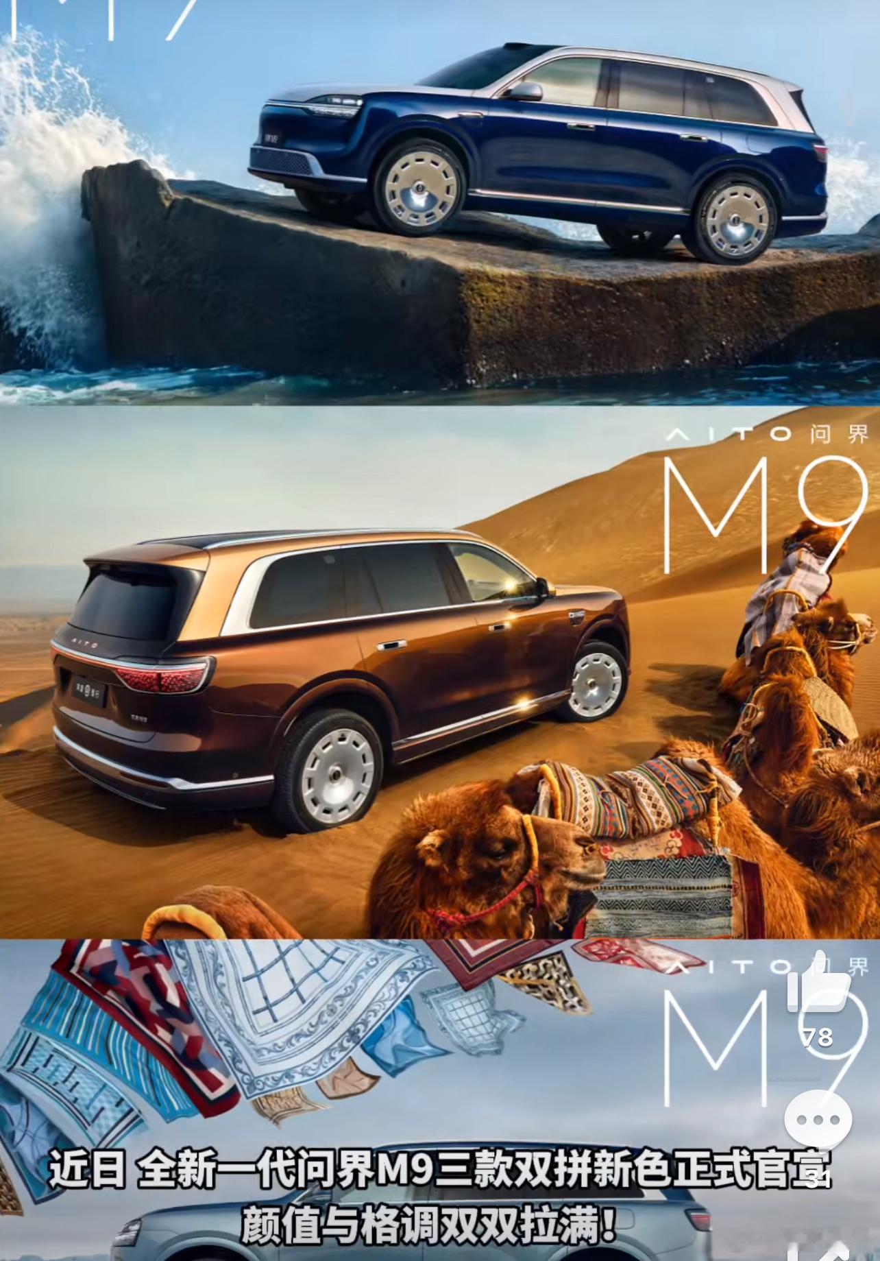 问界不出手则不出手,一出手就一鸣惊人,新款的M9曝光新配色,光双拼颜色就有三种,大漠金棕、赛里木青、沧海银蓝。每一个配色都是我喜欢的,真的科技车皇还是太懂我们消费者心理了!