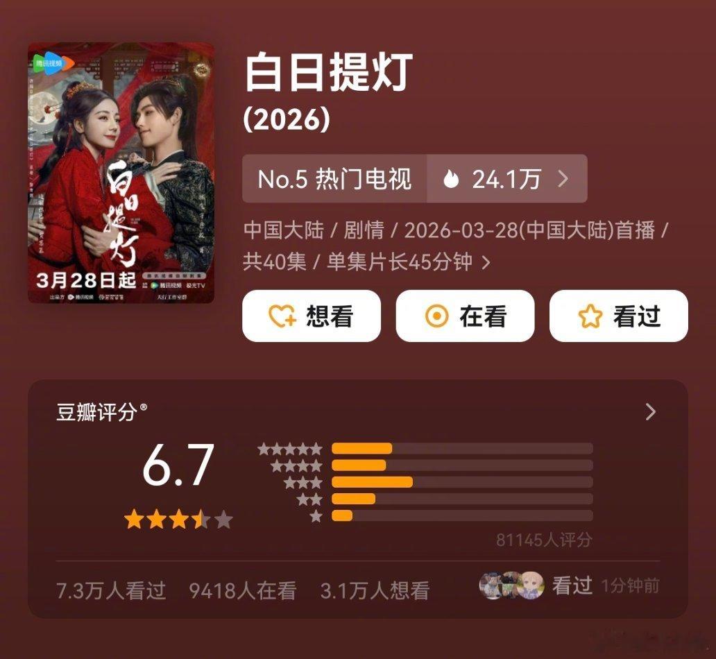 白日提灯豆瓣评分6.7 主演的白日提灯 豆瓣评分6.7,共有8W多人打分,你觉得