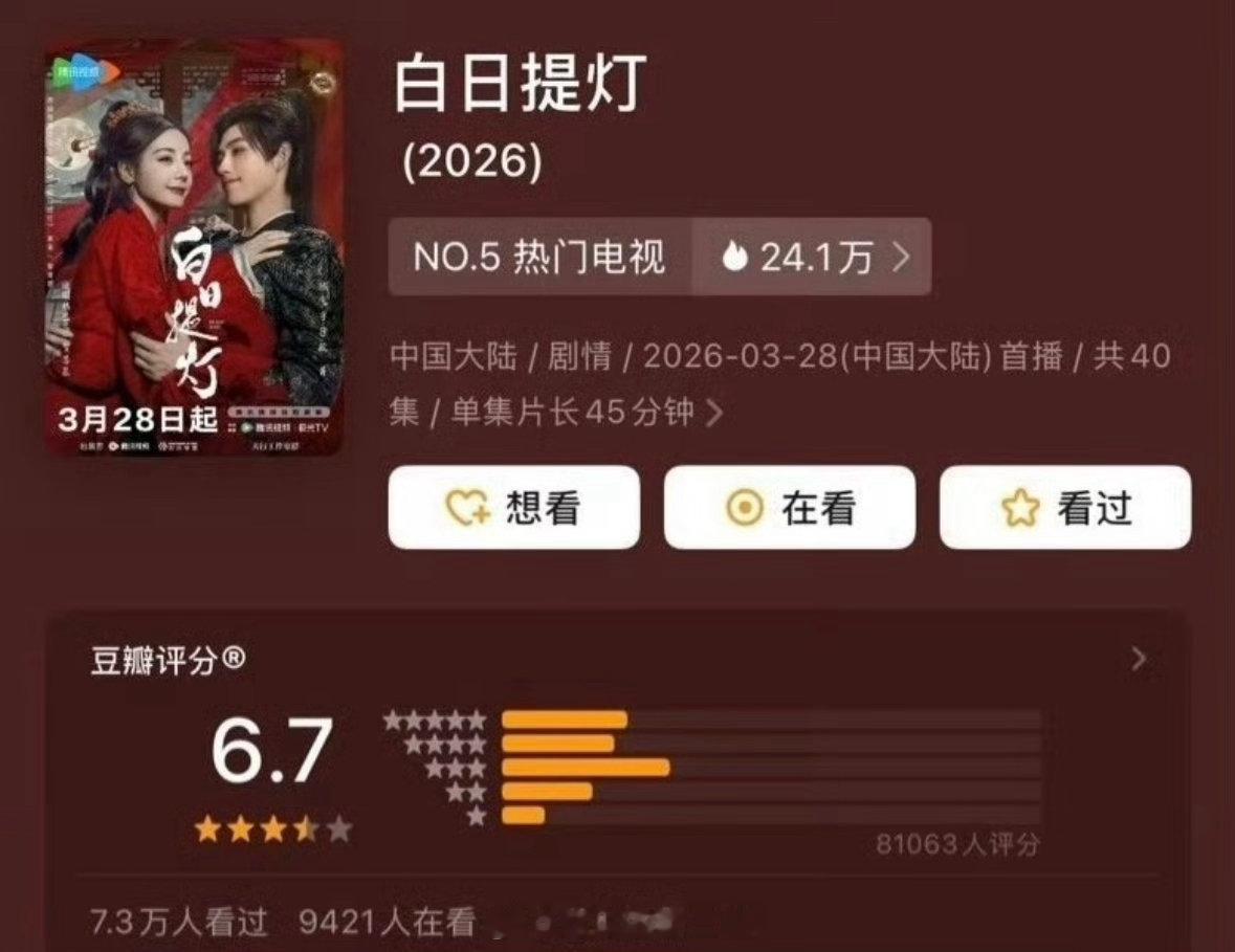 三部新播古偶评分🈶迪丽热巴 陈飞宇《白日提灯》6.7鞠婧祎 田嘉瑞 曾舜晞