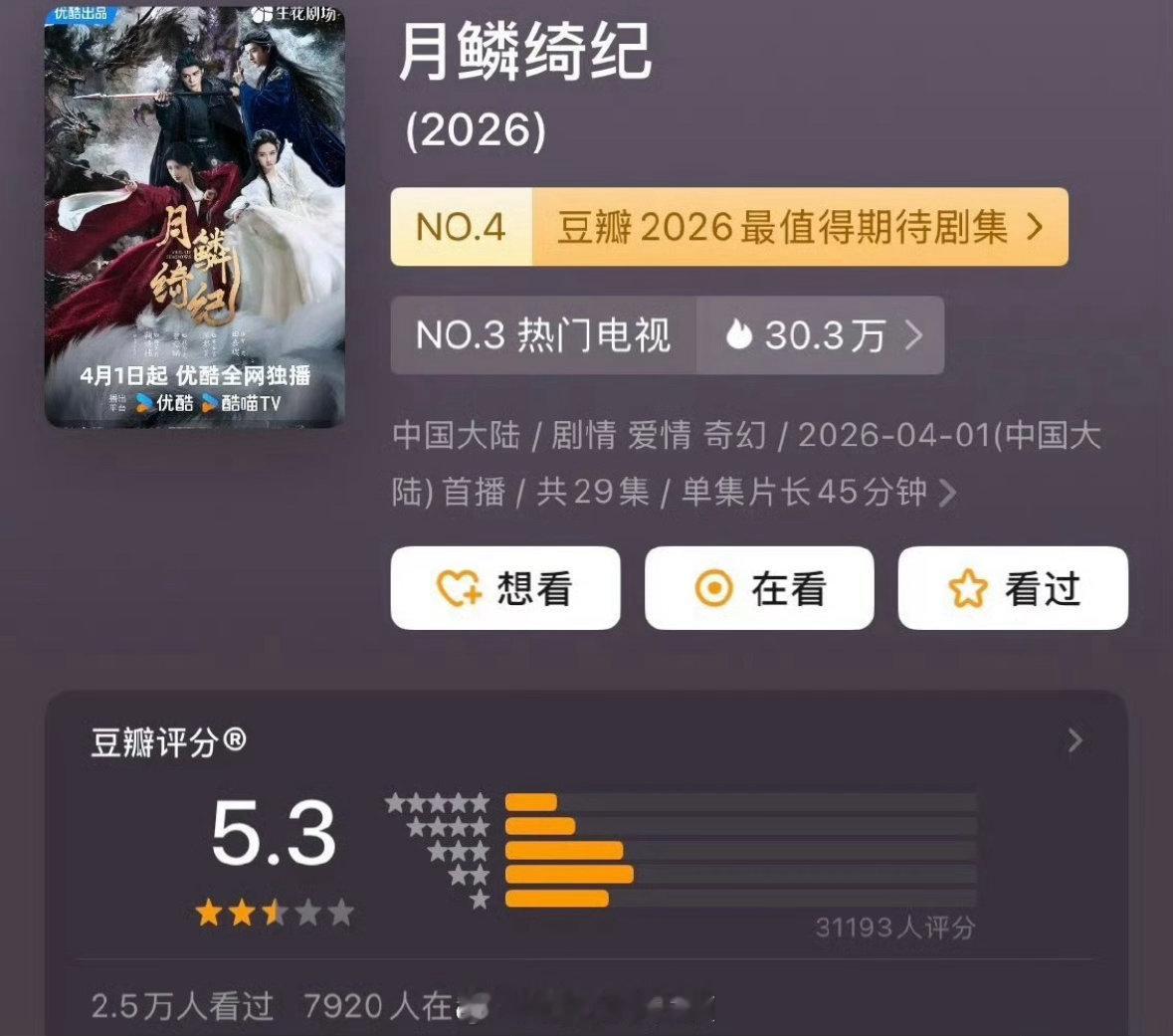 三部新播古偶评分🈶迪丽热巴 陈飞宇《白日提灯》6.7鞠婧祎 田嘉瑞 曾舜晞 陈都灵《月鳞绮纪》5.3李昀锐 黄杨钿甜《冰湖重生》3.2