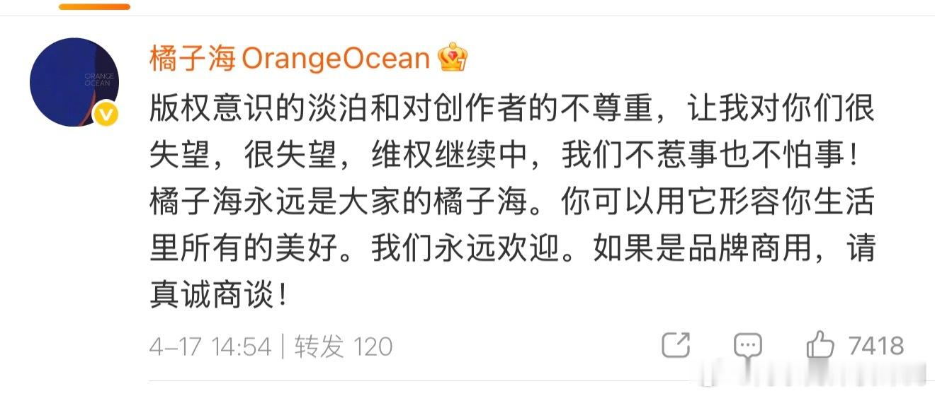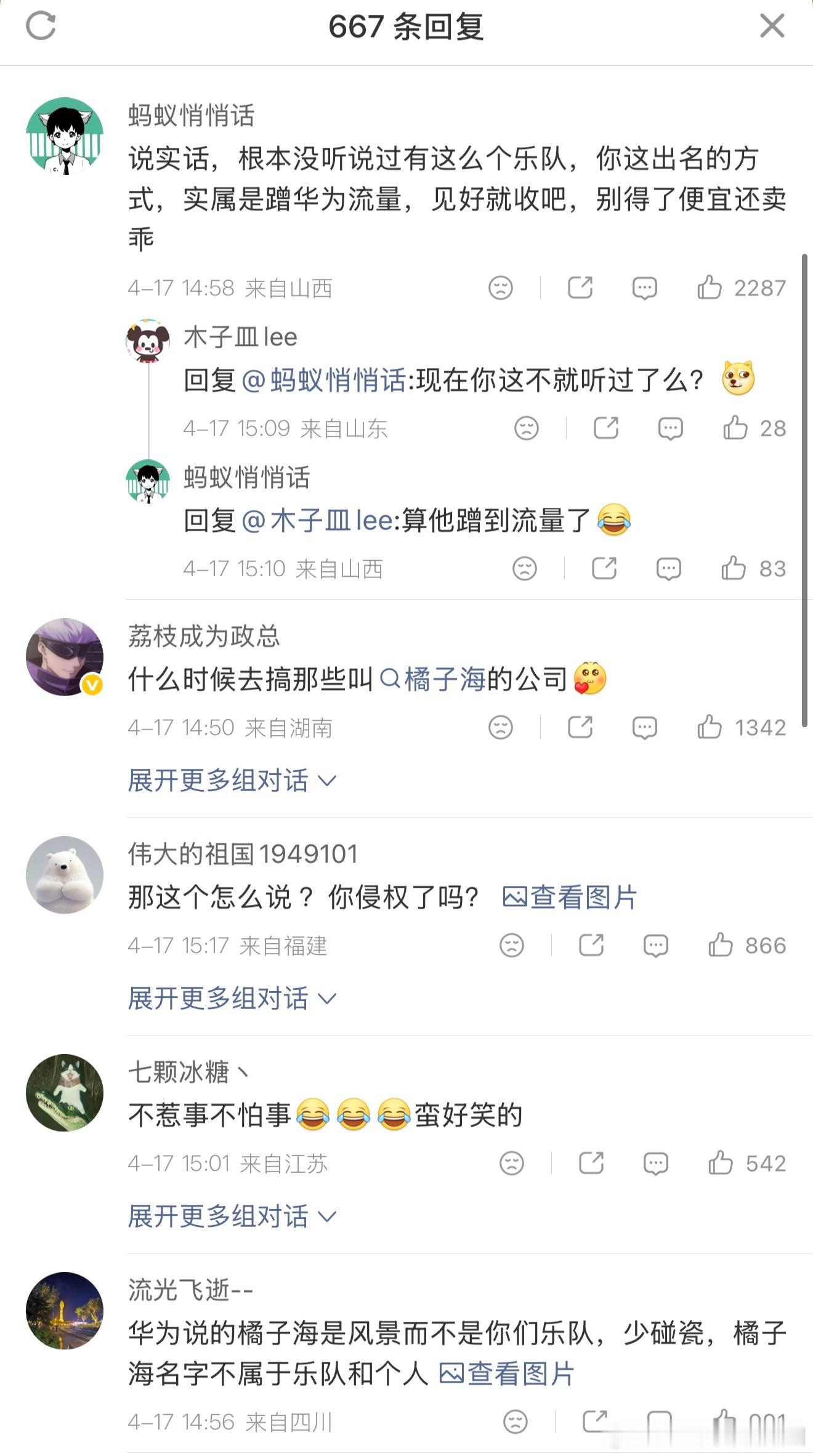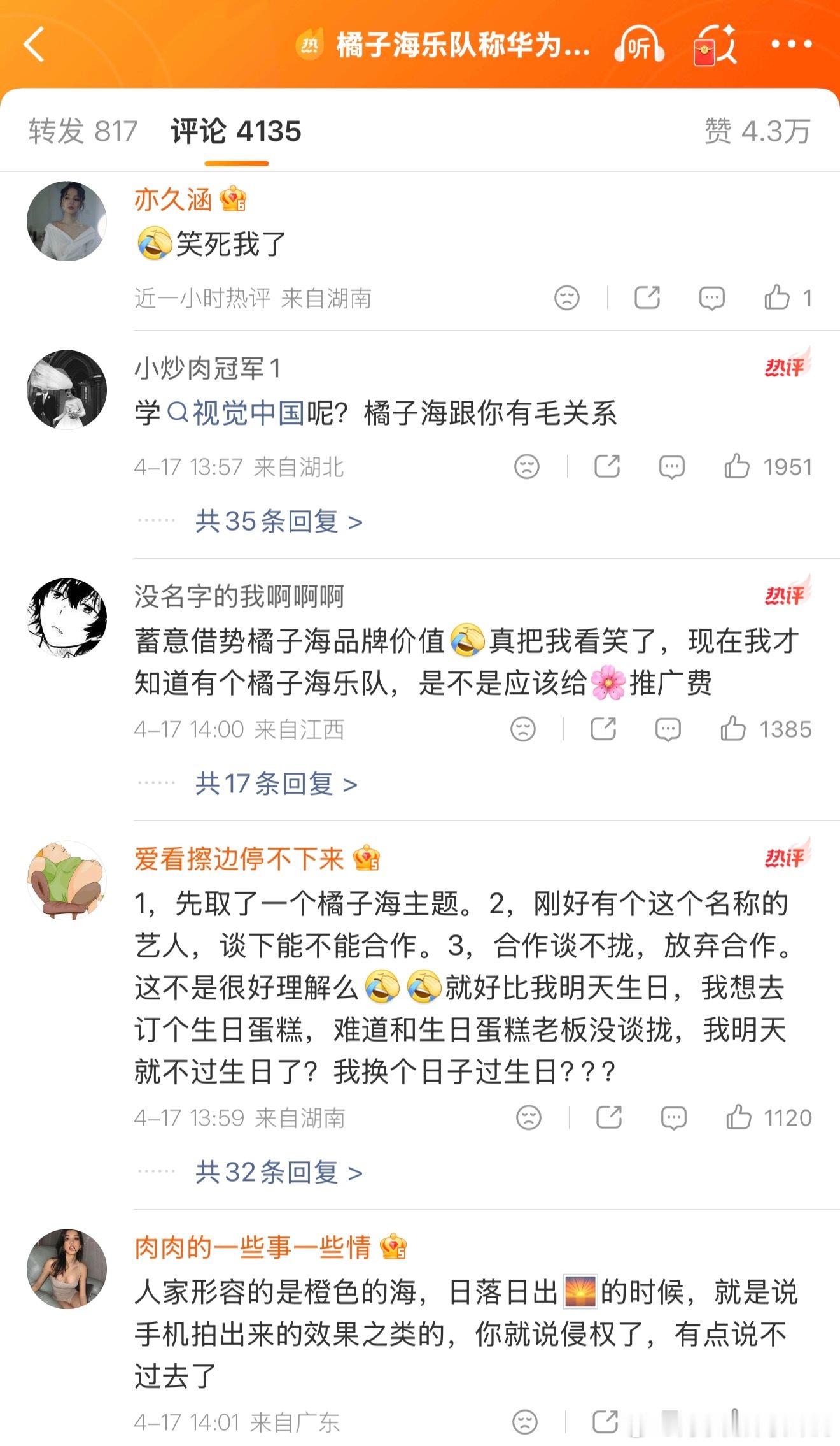 多方已注册橘子海商标忙了一天,回来看到这么抽象的事!这是硬蹭啊作为一个音乐人,你要说作品被别人抄袭了,跑出来喊一喊,结果“他蹭我名字了,我叫橘子海乐队,我是橘子海的唯一”,那以后什么夕阳红,蓝调时刻,都去注册个乐队名字,然后喊全天下的人都不能叫夕阳红