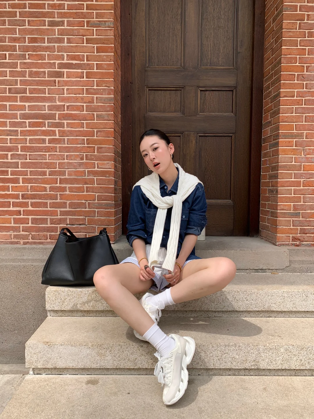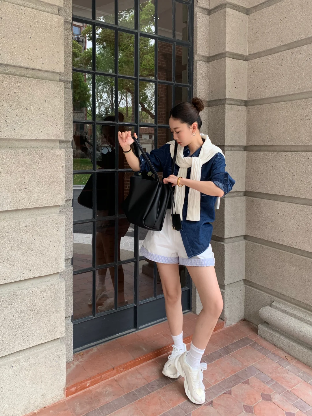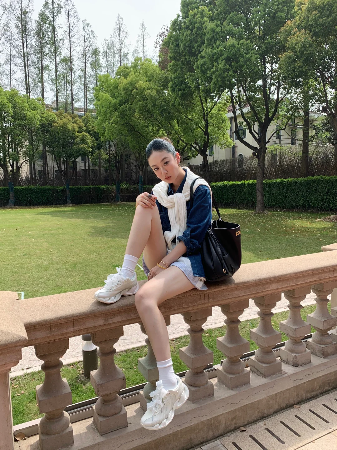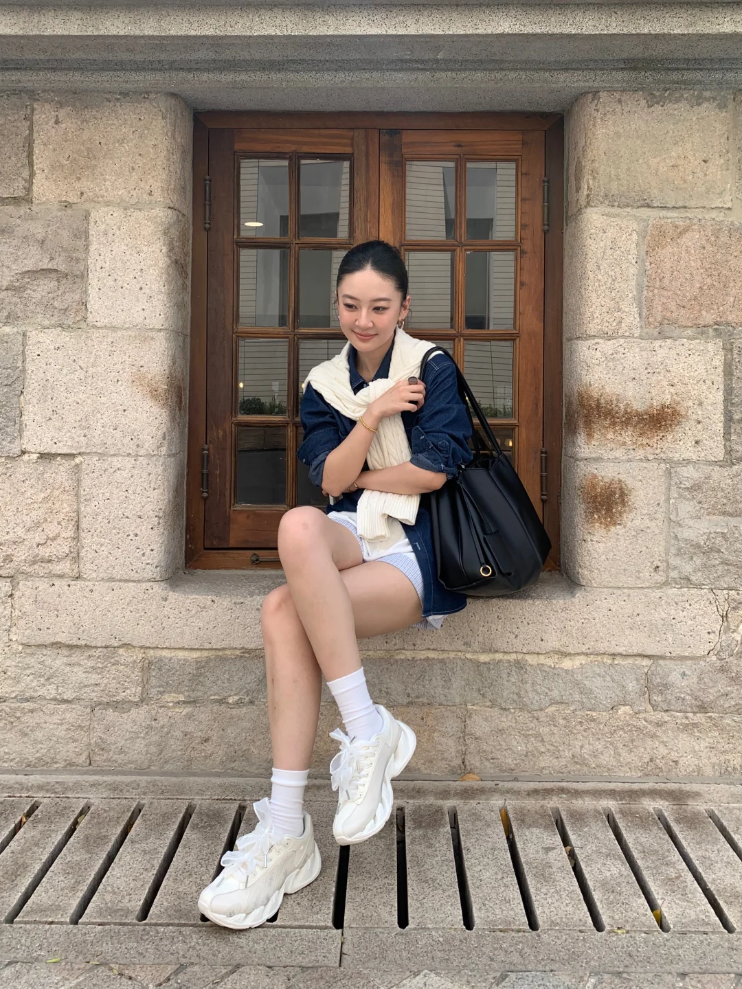 这套是“甜酷拼接风”穿搭,设计感和利落感都很突出:-单品选了黑蓝拼接牛仔
