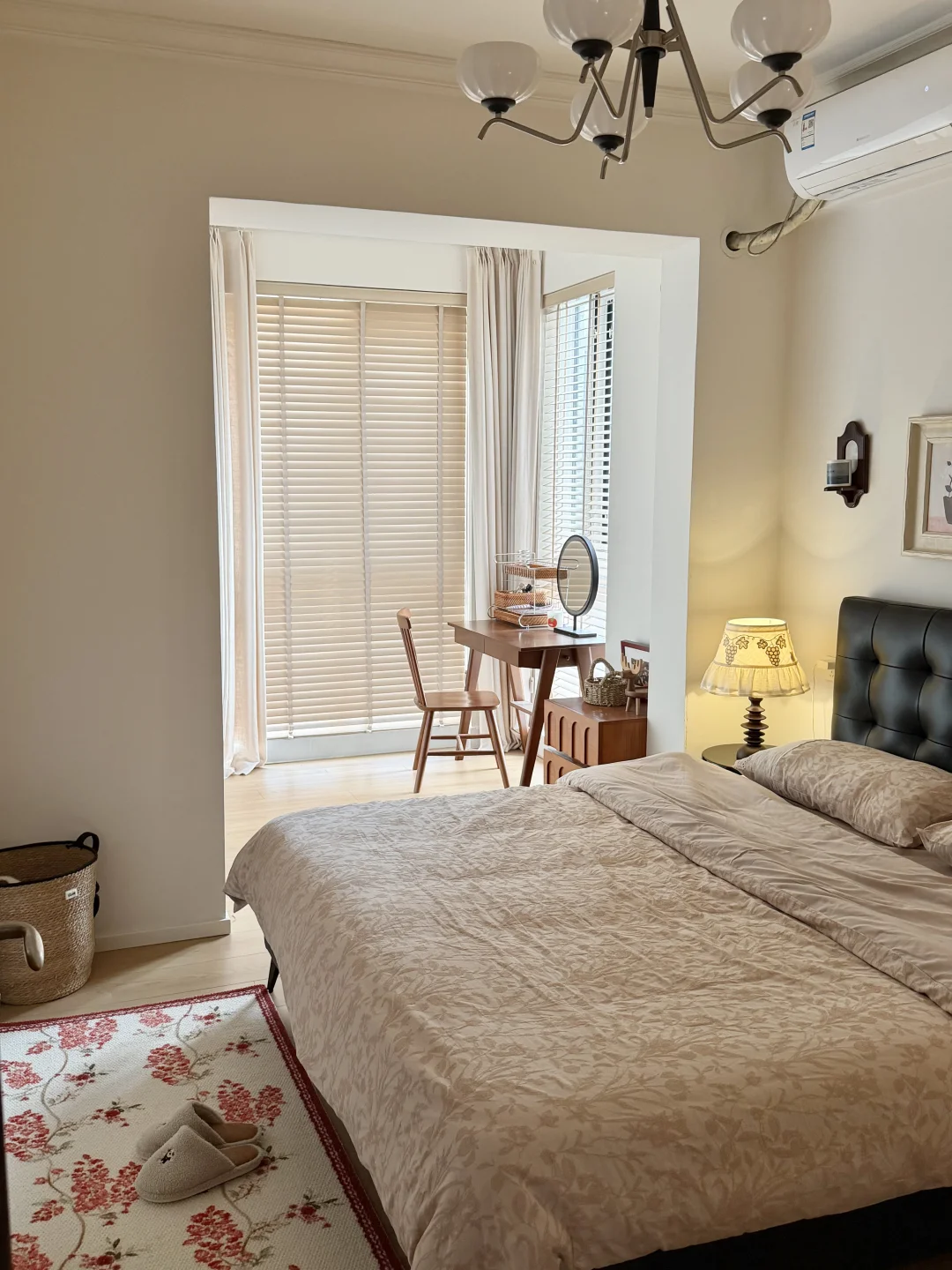 硬装就做了最简单的减法,全屋通刷温柔的浅色系乳胶漆,搭配温润的木色地板,没有复杂的造型,却给软装留足了发挥空间。