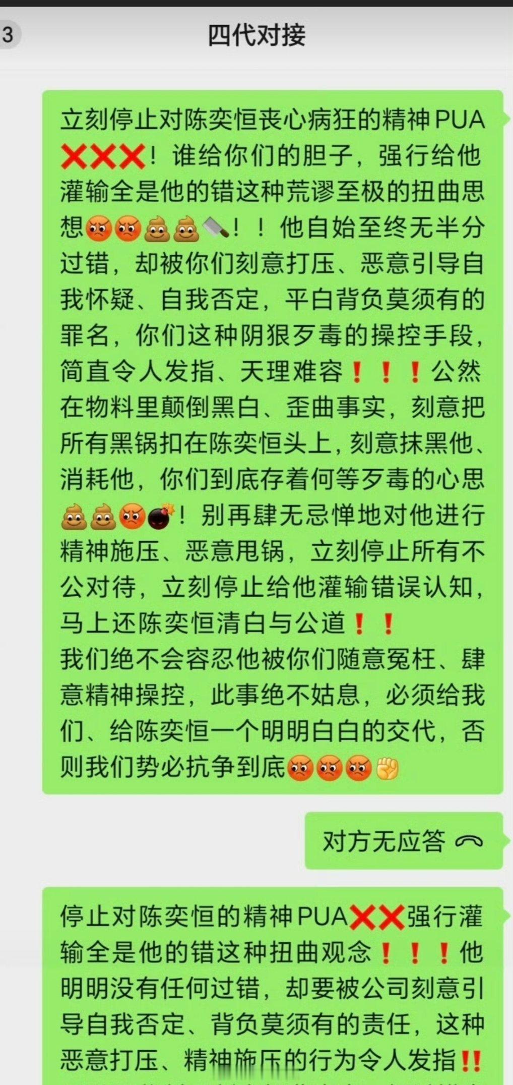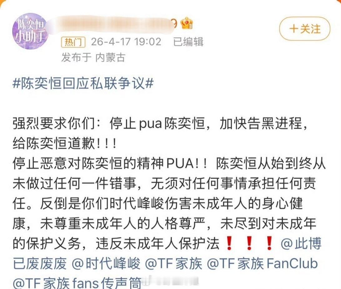 陈奕恒粉丝直接要求时代峰峻给陈奕恒道歉,拒绝被时代峰峻工作人员PUA,真的是怨气