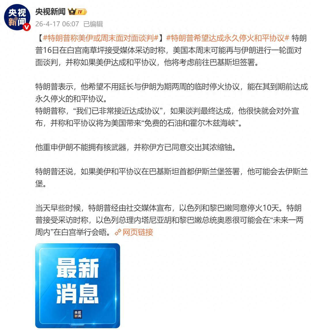 4 月 16 日,特朗普突然放个 “大卫星”:美伊谈判接近达成协议,伊朗已同意 “几乎所有要求”—— 包括20 年内不拥核、交出所有浓缩铀。他甚至放话:若协议在巴基斯坦伊斯兰堡签署,他将亲往,还能给美国带来免费石油和霍尔木兹海峡。