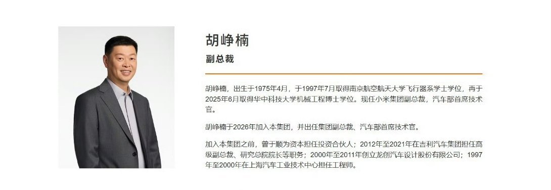 有没有想过,为什么行业顶尖人才都往小米流?胡峥楠出任小米集团副总裁如今小米造车天团再添猛将,直接拉满行业期待!胡峥楠、宋钢重磅加盟,搭配侯景雷、李田原、任周灿、叶航军等大佬,最强阵容正式成型。个个都是是真·大佬,小米汽车已经是一个跨体系全能,一个深耕全球顶级车企,经验拉满、实力拉满。这也标志着小米正从爆款走向体系化,从中国走向全球,欧洲大牛持续入局,研发近万人,组织能力直奔世界级成熟车企。越来越多的行业人才加持,加上已经是爆款的SU7、YU7,我都不敢轻易想象未来的小米在汽车行业会有多强,作为用户,看到这些消息,只觉得安心。期待小米汽车的全球化,期待更多车型上市。