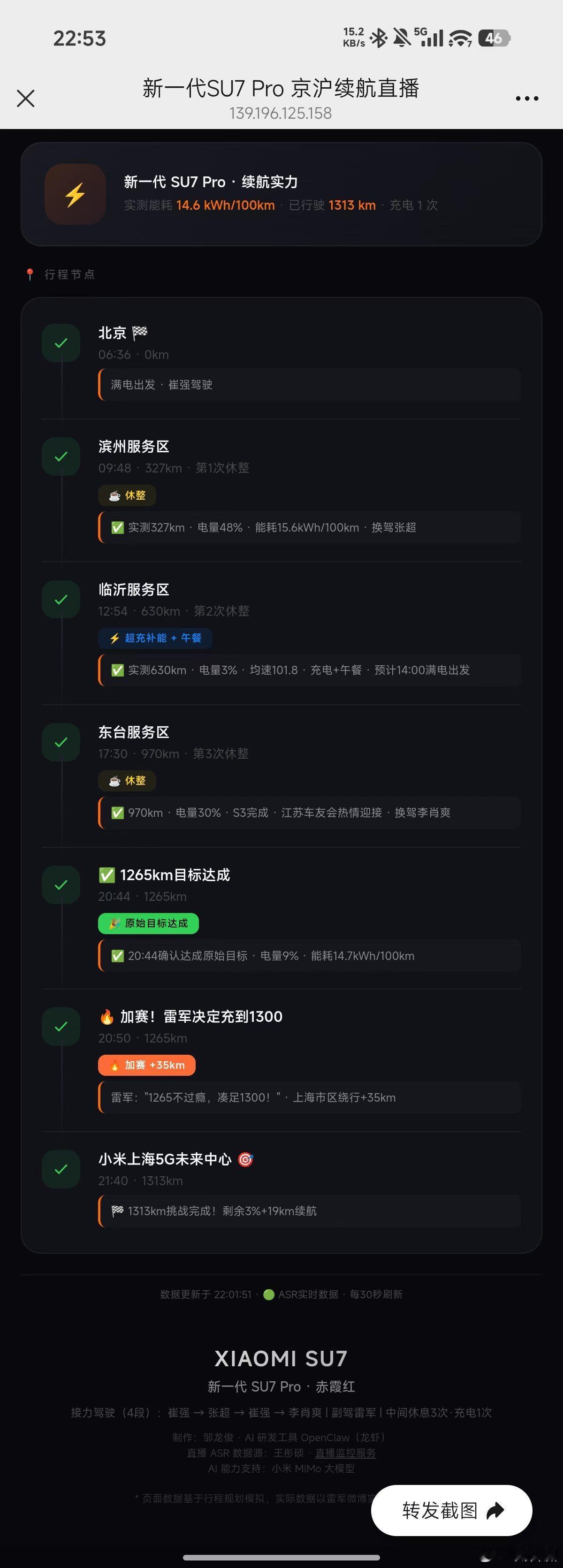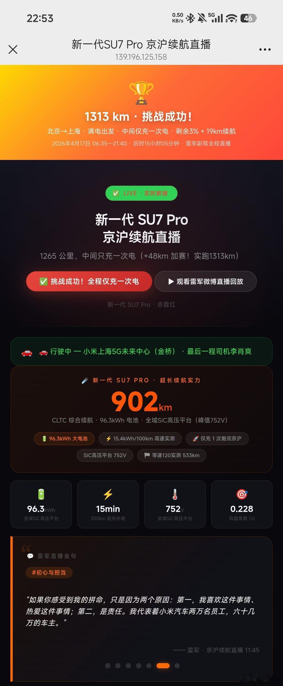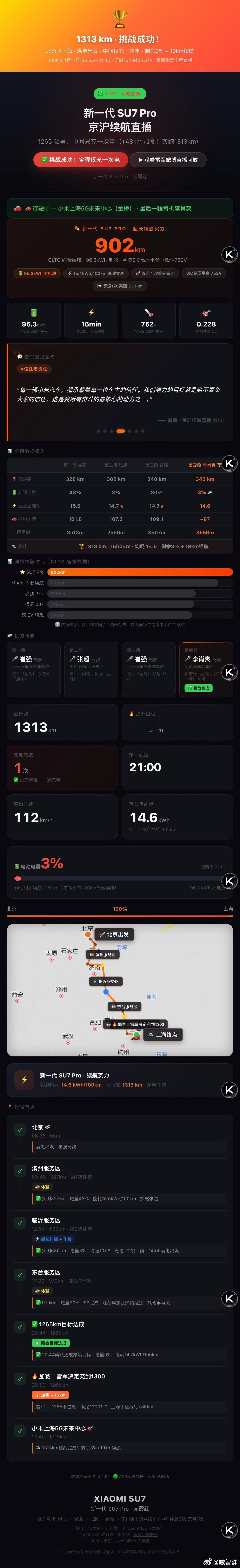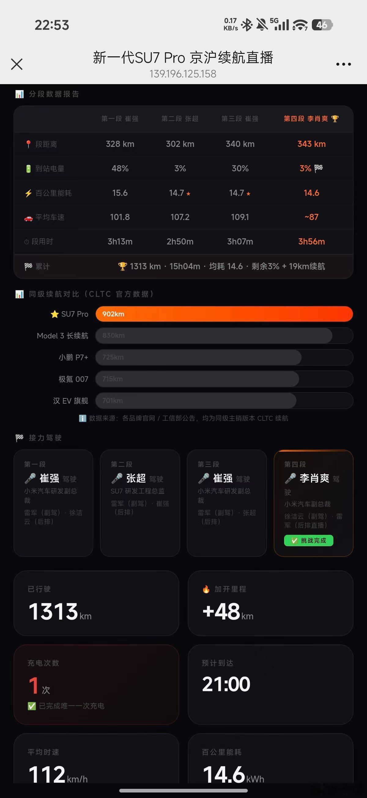 雷军到达上海后还有余电本来计划跑1265km,实际跑了1313km,电池还有3%。全程15小时,平均电耗14.6。