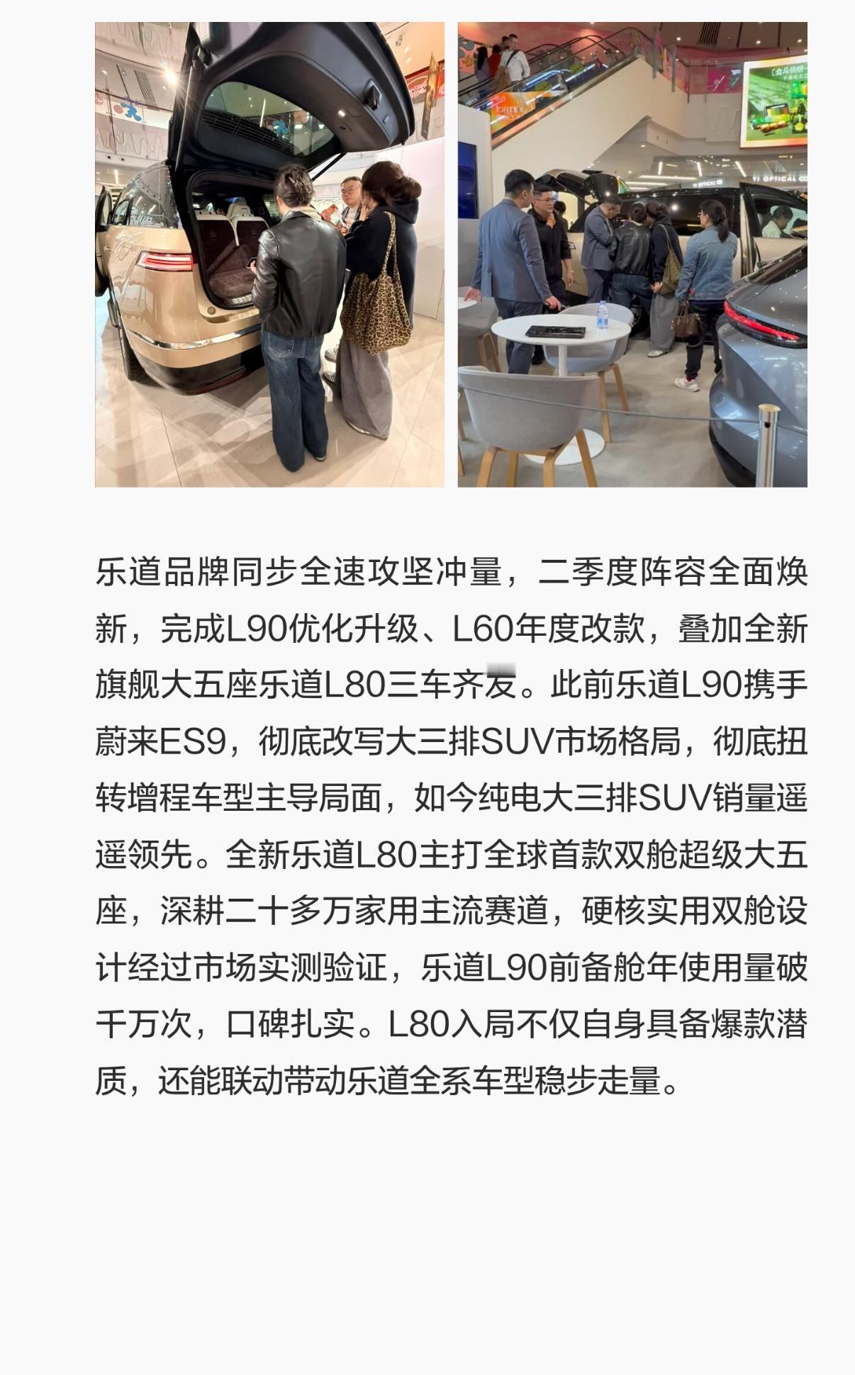 乐道品牌同步全速攻坚冲量,二季度阵容全面焕新,完成L90优化升级、L60年度改款,叠加全新旗舰大五座乐道L80三车齐发。此前乐道L90携手蔚来ES9,彻底改写大三排SUV市场格局,彻底扭转增程车型主导局面,如今纯电大三排SUV销量遥遥领先。全新乐道L80主打全球首款双舱超级大五座,深耕二十多万家用主流赛道,硬核实用双舱设计经过市场实测验证,乐道L90前备舱年使用量破千万次,口碑扎实。L80入局不仅自身具备爆款潜质,还能联动带动乐道全系车型稳步走量。