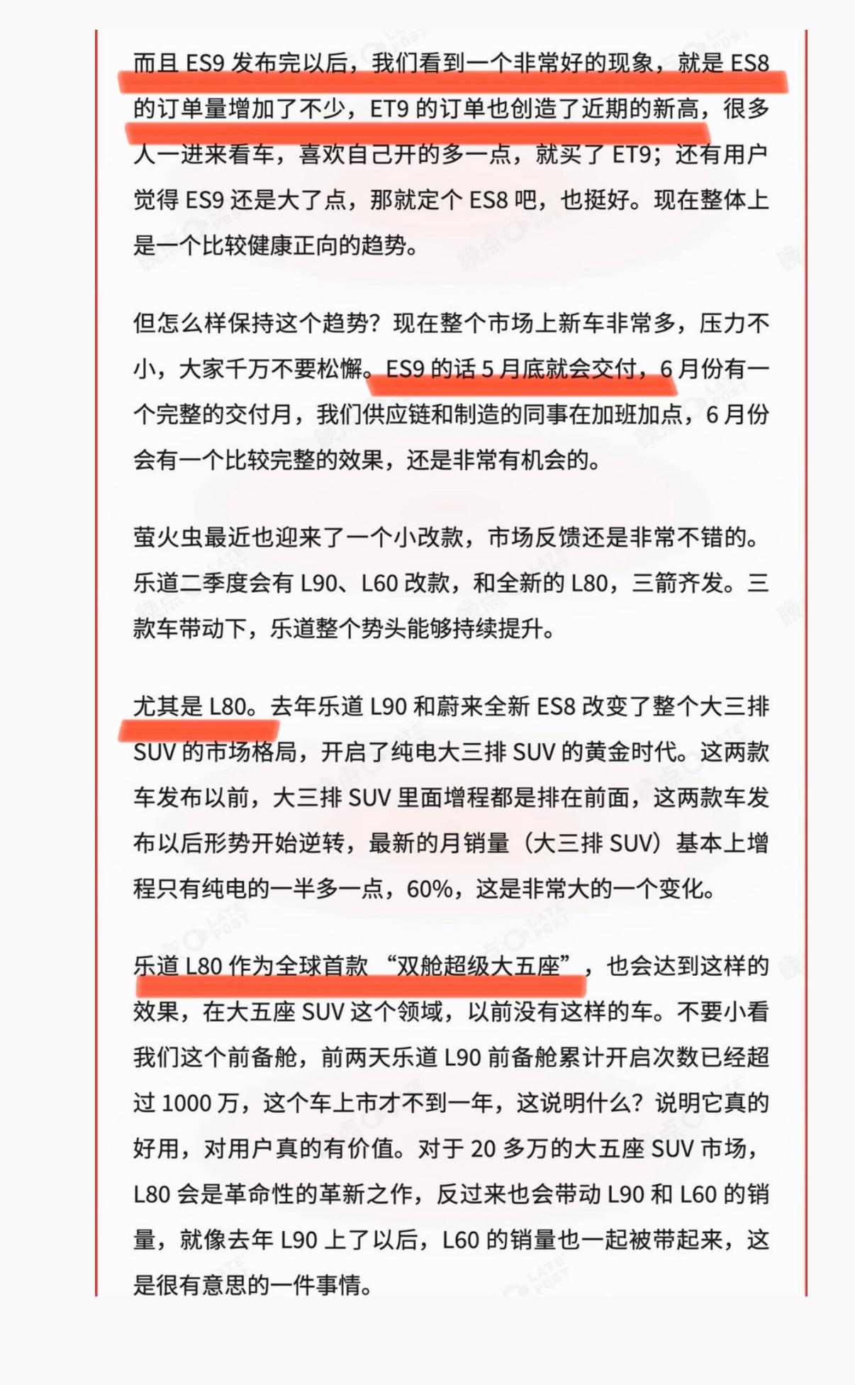 蔚来ES9上市口碑、订单双线飘红,综合预订表现大幅超出内部预期。新车核心实现强势破圈,大批从未选购过蔚来的全新用户主动下订,新客订单体量远超同期ES8水准。同时车型形成内部正向联动热度,不少看车用户按需分流选购ES8、ET9,直接拉动两款在售旗舰订单回暖,整体销售结构愈发健康。目前产能保供全速推进,ES9敲定5月底开启交付、6月全面产能拉满,规模化放量在即。