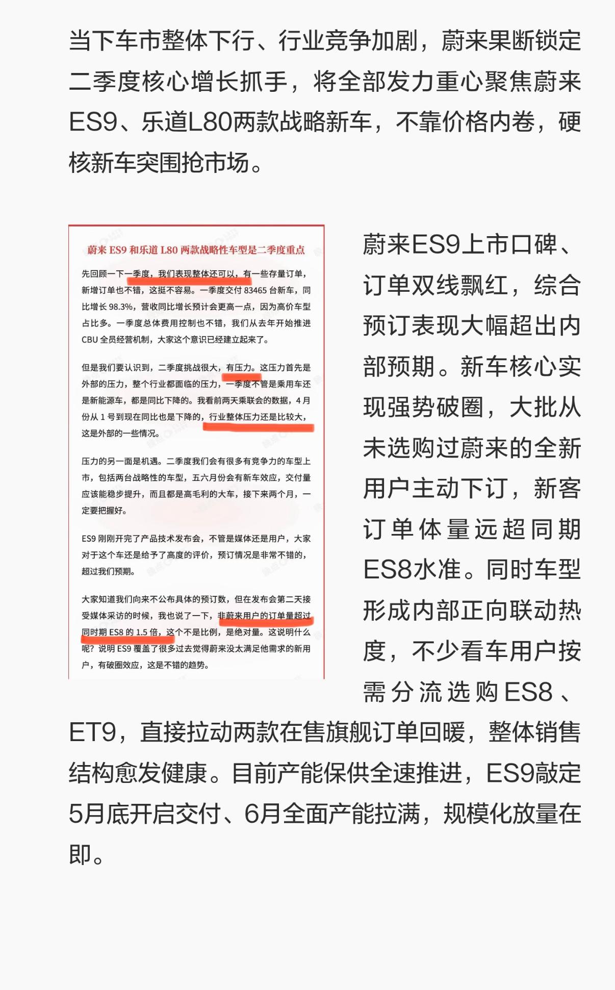 当下车市整体下行、行业竞争加剧,蔚来果断锁定二季度核心增长抓手,将全部发力重心聚焦蔚来ES9、乐道L80两款战略新车,不靠价格内卷,硬核新车突围抢市场。