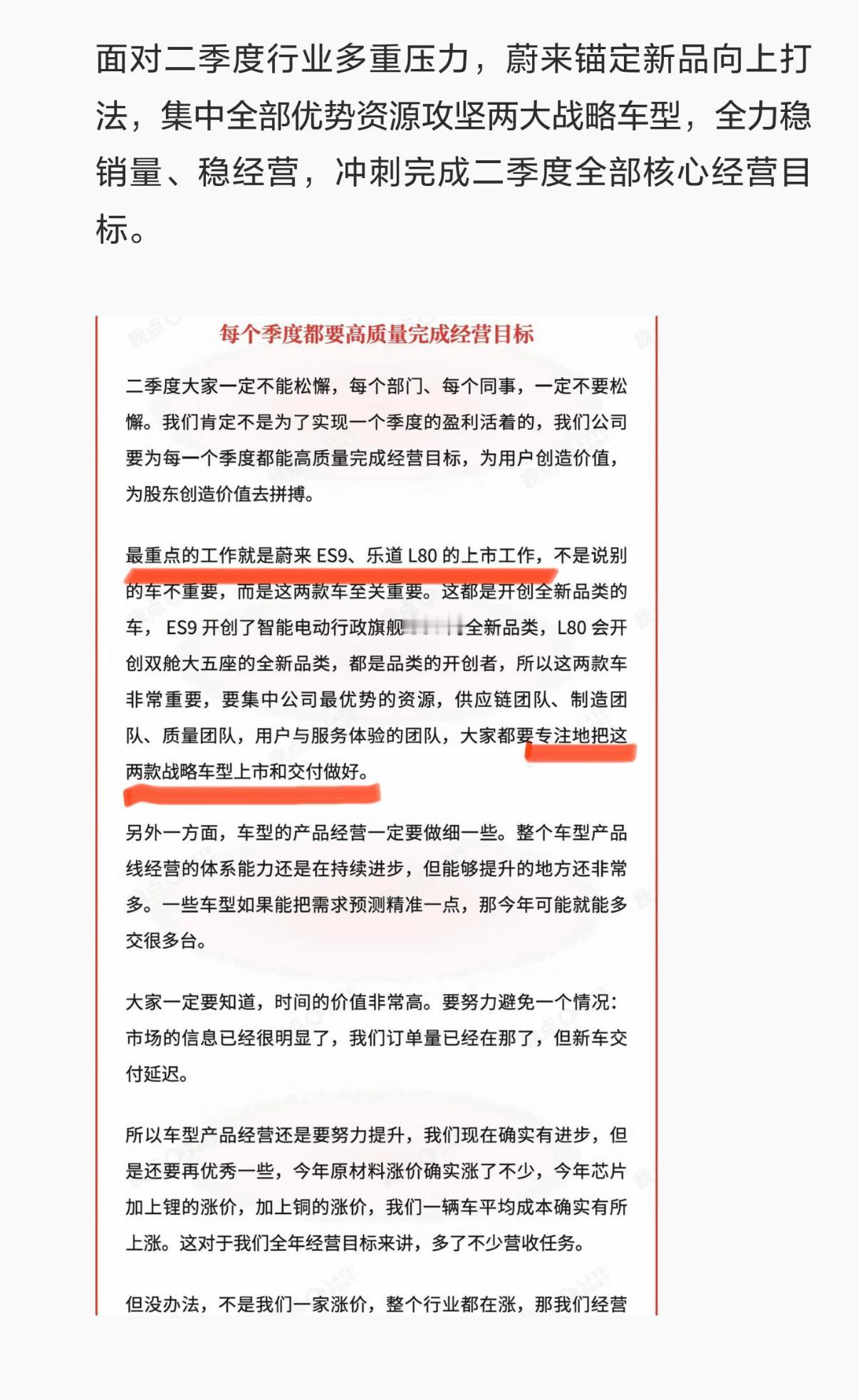 面对二季度行业多重压力,蔚来锚定新品向上打法,集中全部优势资源攻坚两大战略车型,全力稳销量、稳经营,冲刺完成二季度全部核心经营目标。