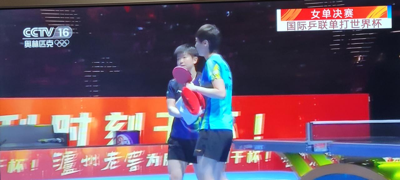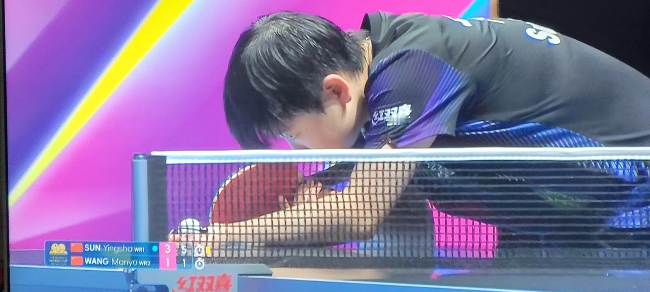 莎莎大比分8:4领先曼昱时,觉得一是她打比赛的专注度有些下降,打球稍嫌随意。二是她开始使用了发长球,长球效果并不好,但她没有改变发长球,有些犟,一发到底,直至输掉该局。第五局开始后,倔强的莎莎终于一个长球也没有发,专注度又回到了很高的程度,前三板尤其是侧身正手攻的力度回归正常,很快以10:3领先。但是曼昱的强大韧性和永不放弃的精神再一次迸发,又连追4分,将比分缩小至10:7,这时的莎莎再也没敢怠慢,把握住关键球,11:7拿下第五局,从而以4:1战胜曼昱,连续第三次捧得世界杯,创造了历史。