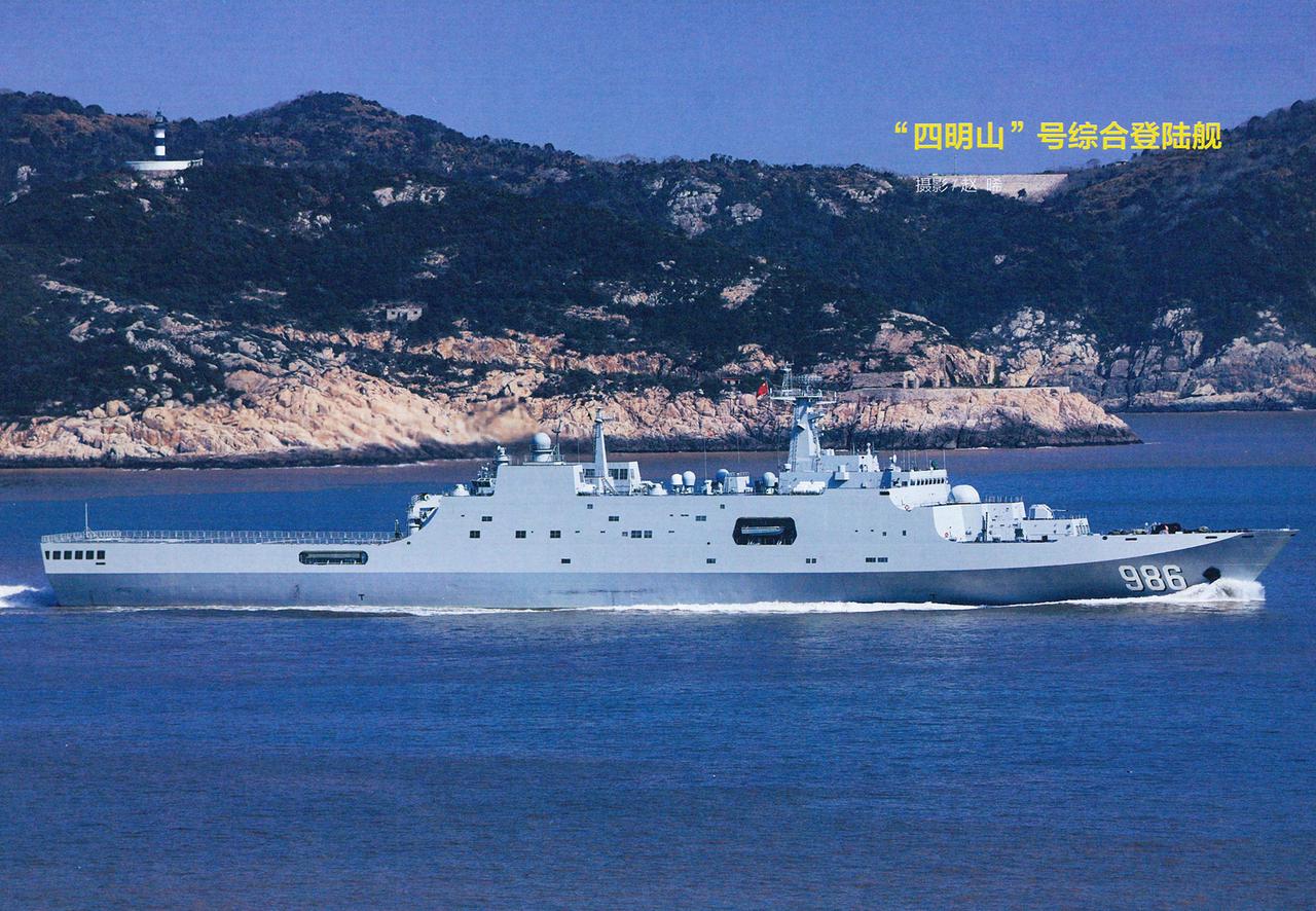 海军两栖编队正在航行中,071级四明山号上的激光武器还没有打开保护罩,向世界露出