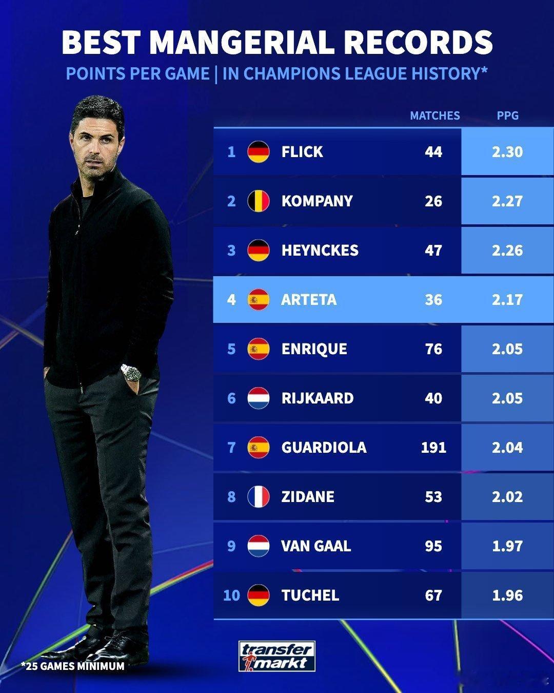 孔帕尼已经荣登欧冠场均积分教练榜第二名,第一名和第三名都是拜仁的欧冠教头,加油吧