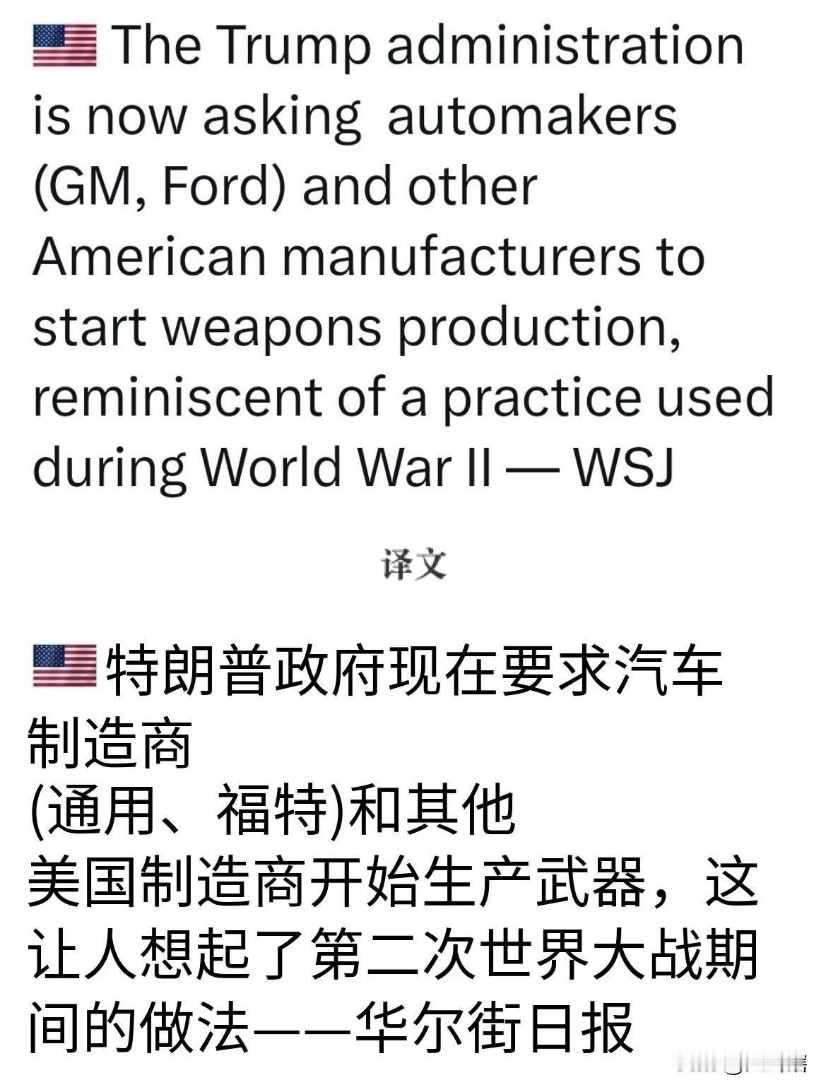 据《华尔街日报》消息,美国政府正在和美国汽车制造商福特、通用进行沟通,希望借助企业产能帮助美军生产武器弹药和军工用品。