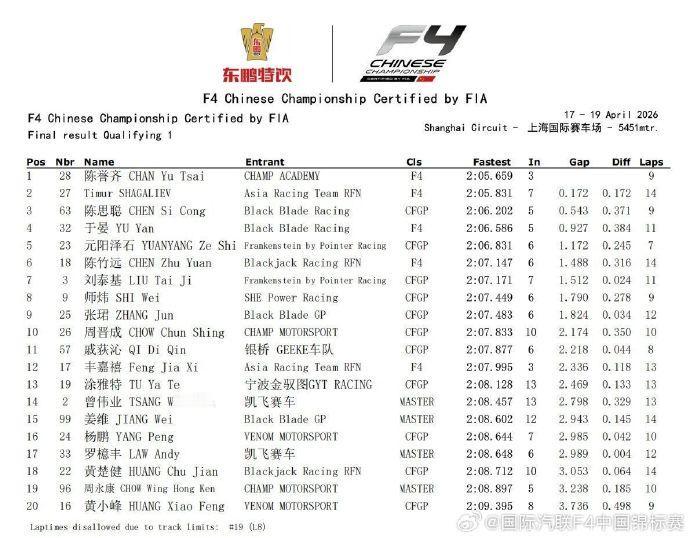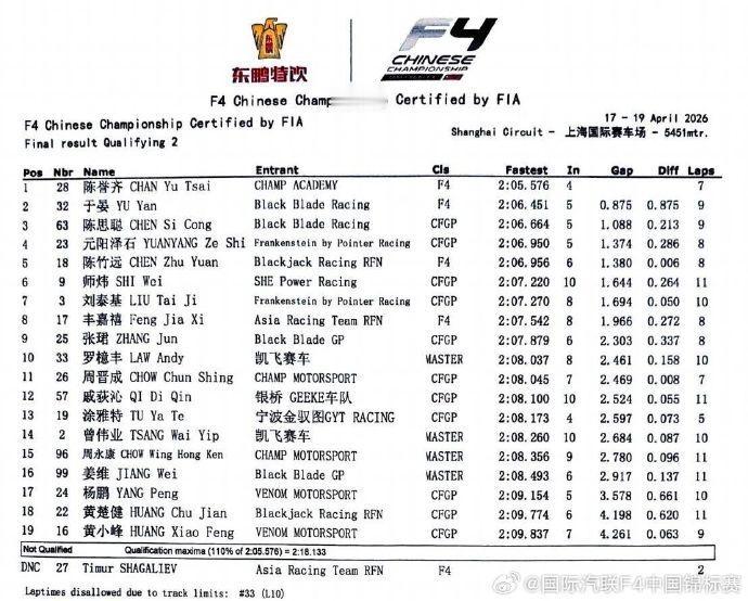 兄弟们,F4方程式中国锦标赛上海站的排位赛刚打完,有个名字值得记住——陈誉齐。