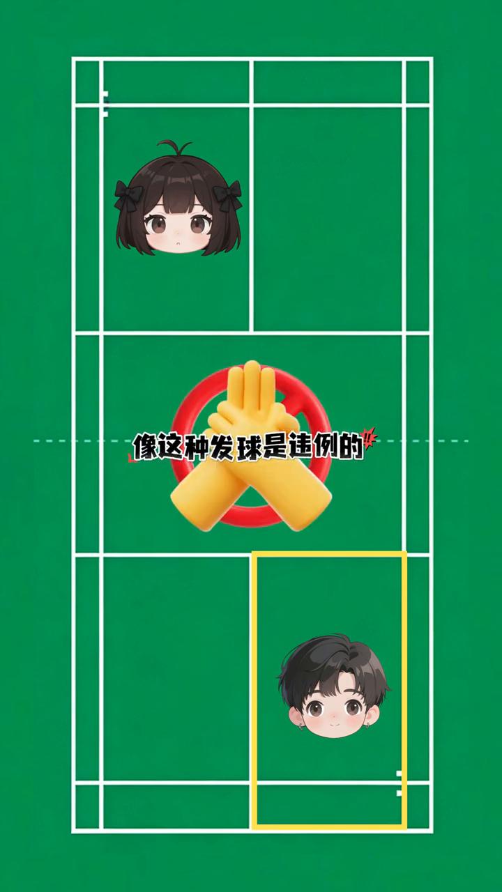 举例说明:李雷和韩梅梅比赛,李雷在右区发球比时斜对角发给韩美美,像这种发球是违例的,会判丢分。李雷得分后则换至左半区继续发球,遵循双数在右,单数在左的规则。在左半区发球分一比零,以此类推。当比分至二十平时连续得两分方为胜,当二十九分平时先获得三十分方为胜。比赛采取二十一分制,三局两胜。