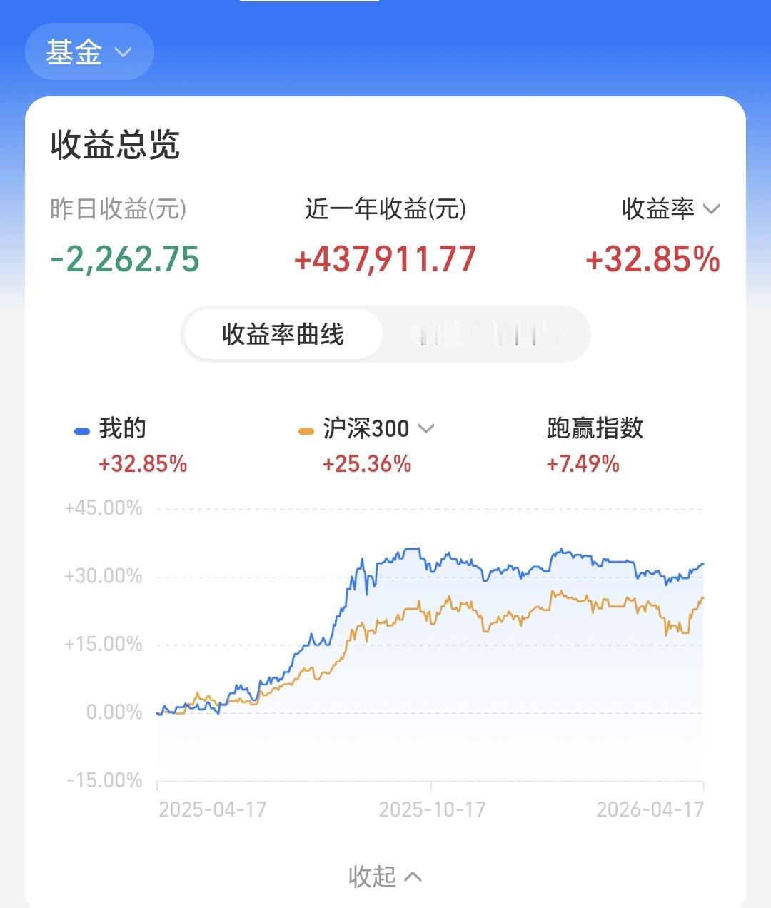 近一年以来收益437911元,收益率32.85%,跑赢了沪深300指数25.86%的上涨幅度。