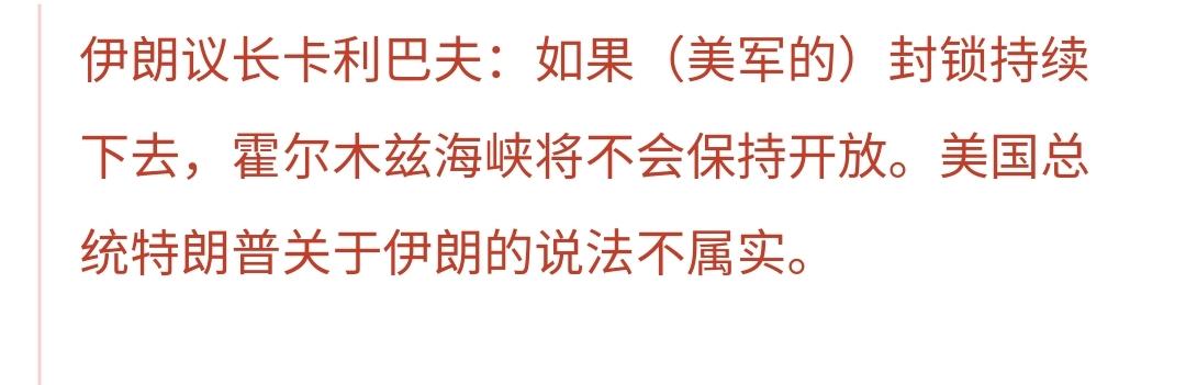 根据最新消息,伊朗议长说,如果美国继续封锁霍尔木兹海峡,伊朗也将不会保持对霍尔木兹海峡开放,美国总统特朗普的话是不属实的。