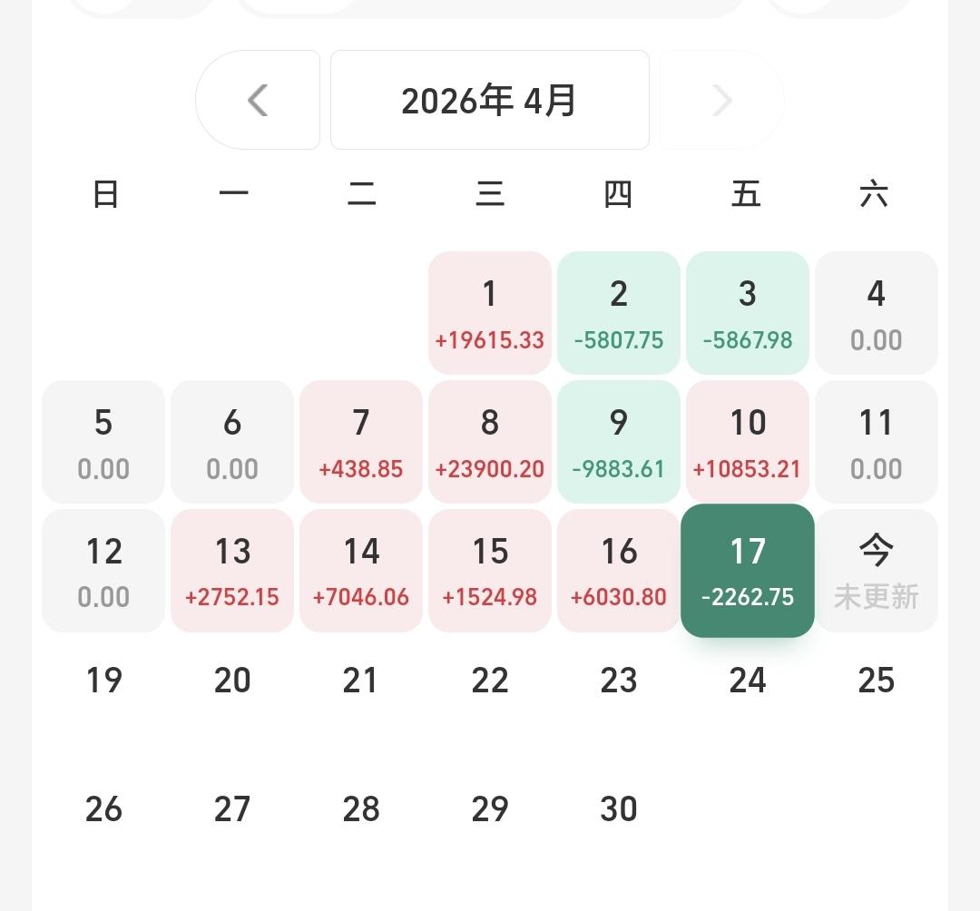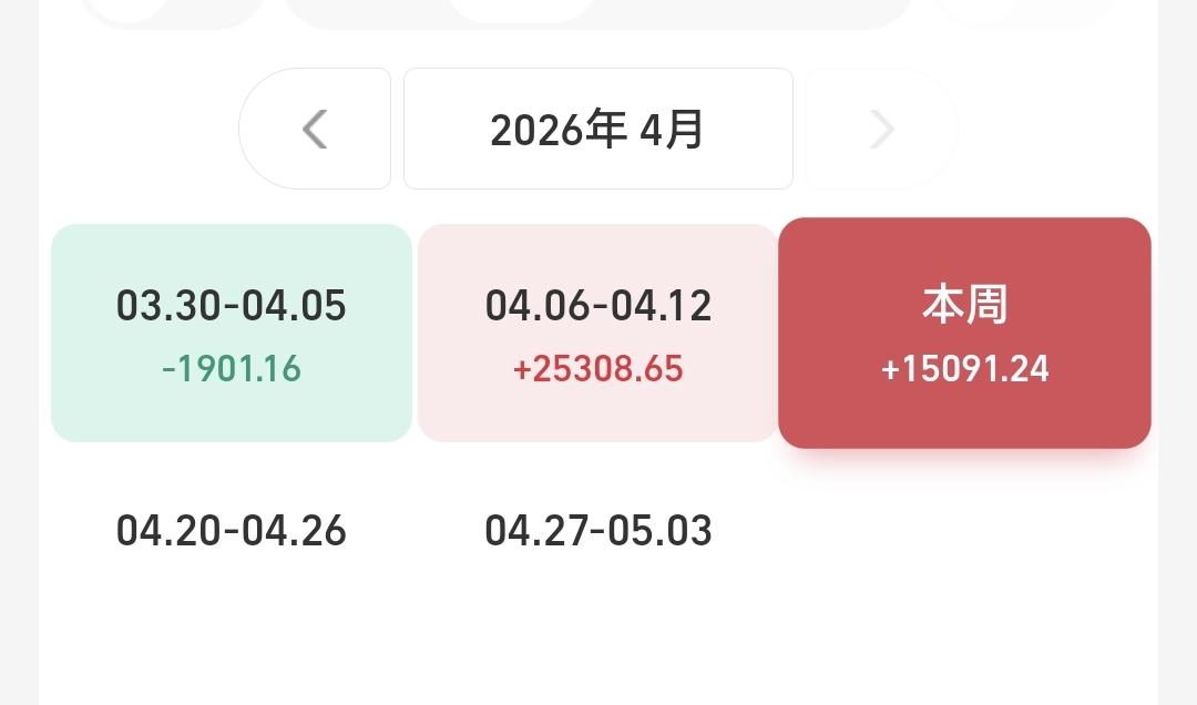 上周五个交易日,一亏四盈,一个交易日亏损,四个交易日盈利,周收益15091元。