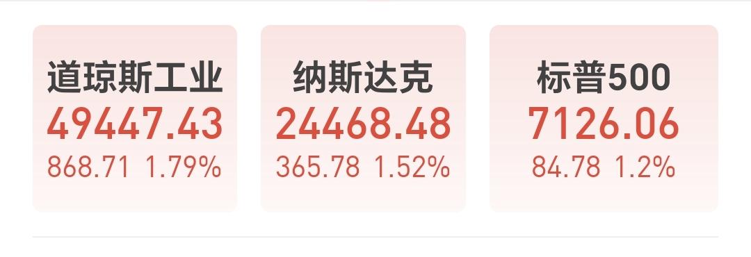 美股市场昨天晚上也是上涨,道琼斯指数上涨了1.79%,纳斯达克指数上涨了1.52%,标普指数上涨了1.2%,上涨幅度都在1%以上。