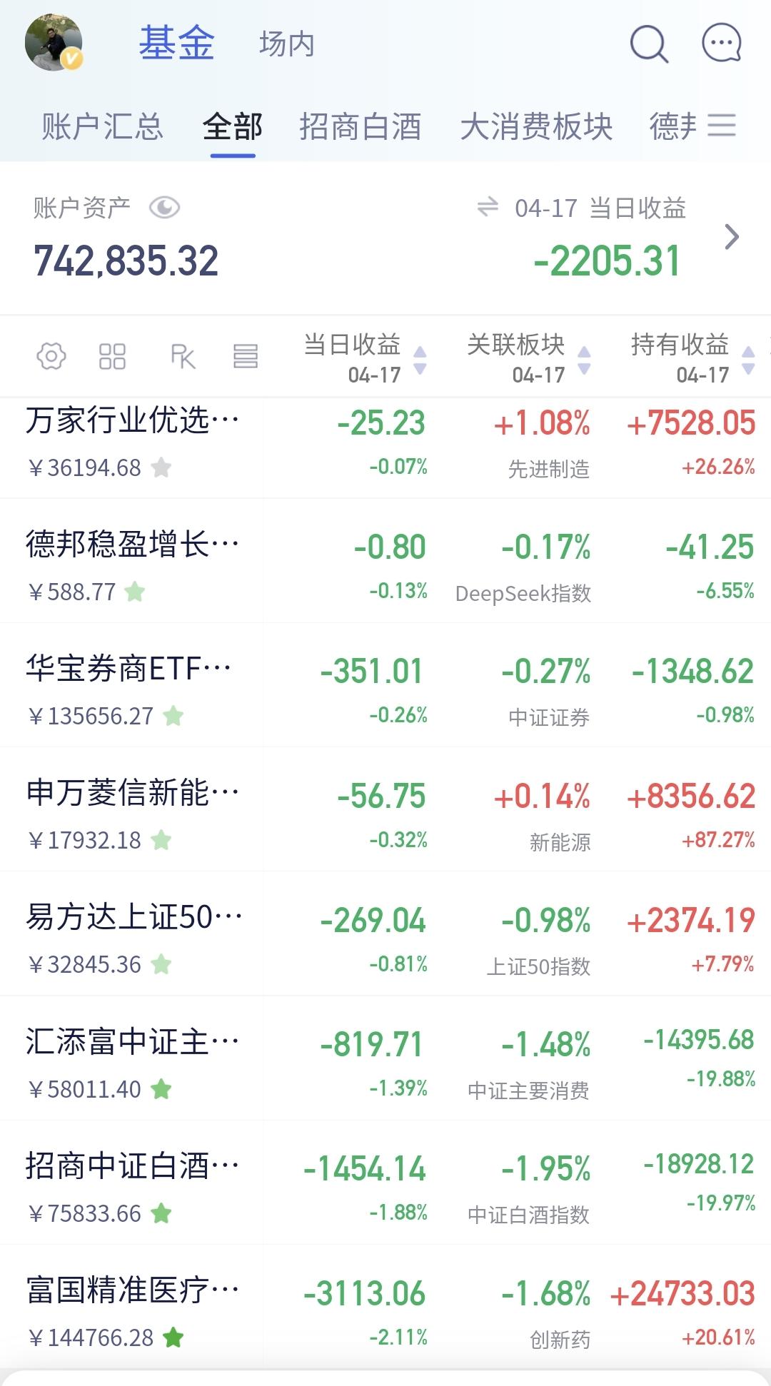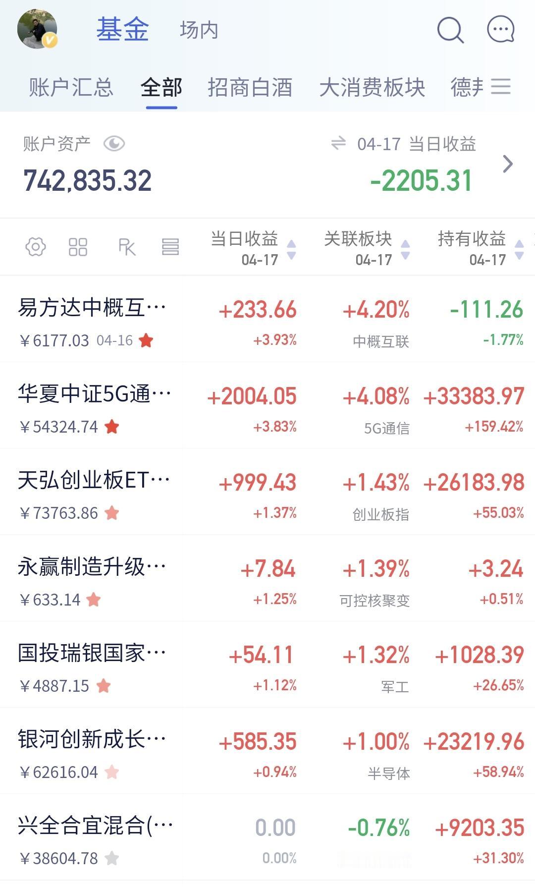 持有的基金中,昨天晚上净值更新以后,上涨幅度最大的三个板块是:5G板块,创业板指,可控核聚变板块,下跌幅度最大的三个板块是:创新药板块,白酒板块,大消费板块。