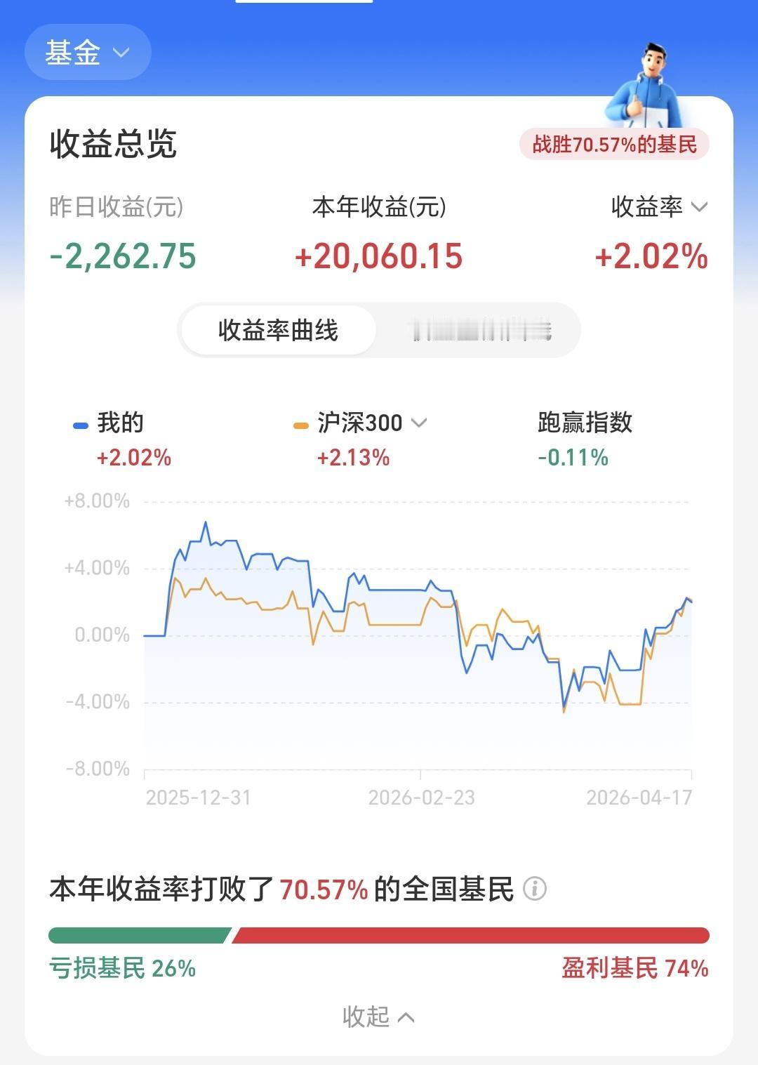 今年以来收益20060元,收益率2.02%,跑赢了全国70.57%的基民,跑输了沪深300指数2.13%的上涨幅度。