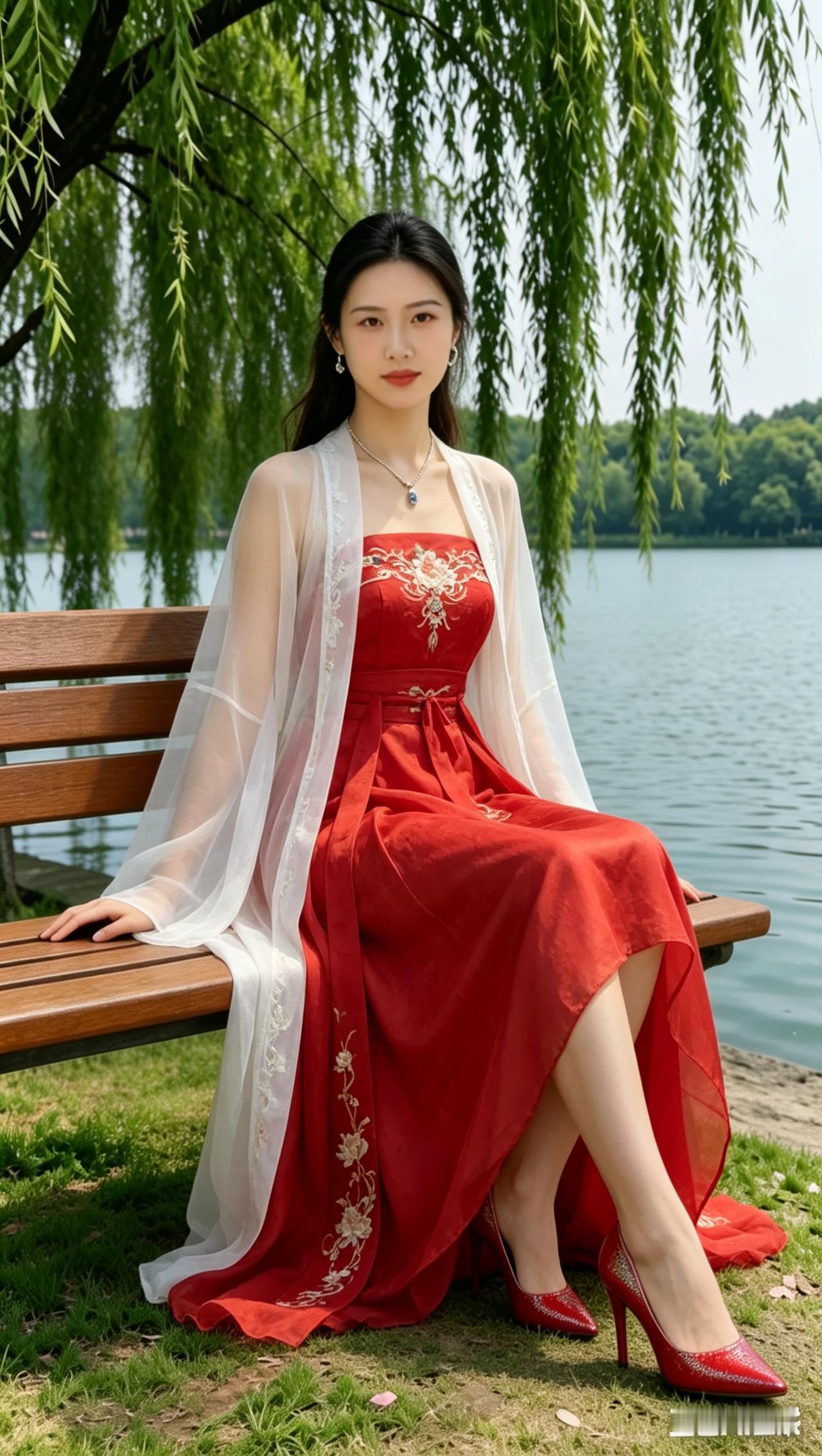 湖畔红裙美人,优雅坐于长椅,绿树环绕,美不胜收。什么样的女人最有吸引力 细观美女