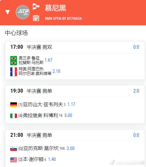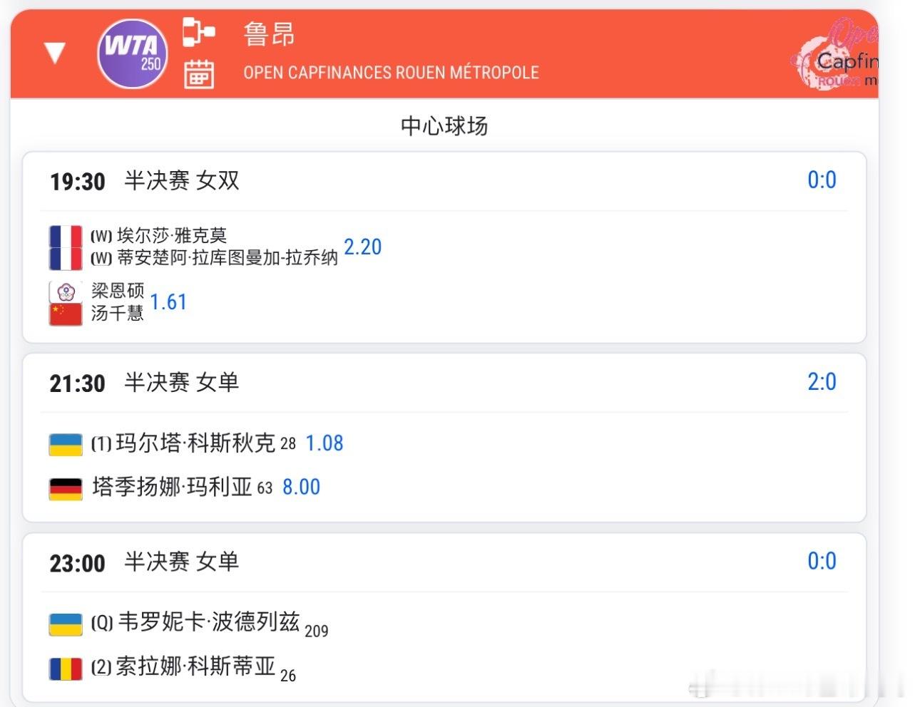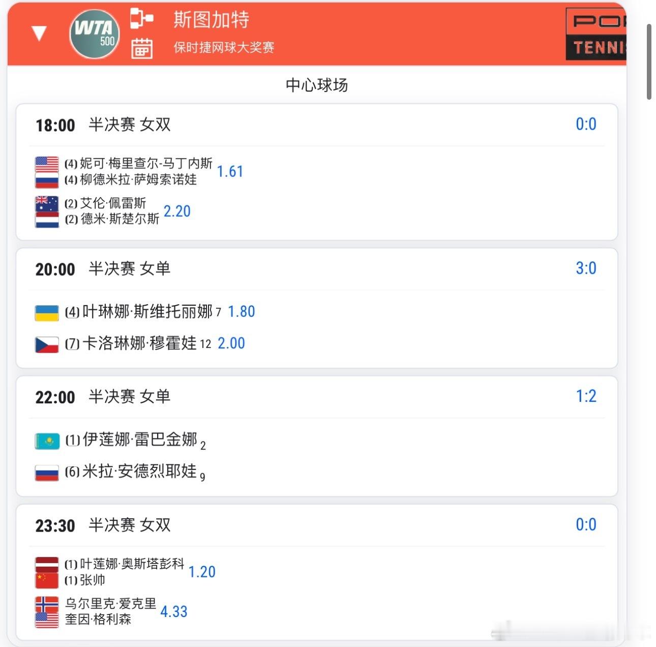 WTA斯图加特中心场20点斯维托丽娜🇺🇦vs穆霍娃🇨🇿22点莱巴金娜🇰🇿vs安德烈娃🇷🇺随后张帅🇨🇳/奥斯塔彭科🇱🇻双打半决赛