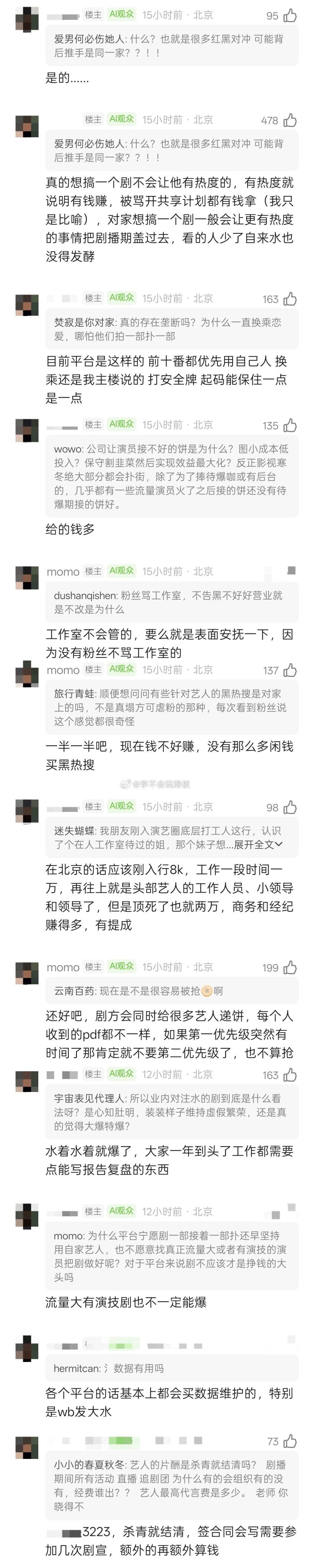 业内离职曝行业内幕:有的剧方会为了热度自己制造负面舆情,比如自己发某剧发大水的通稿,然后很多乐子人就会去看热闹,看看到底有多水,然后这个剧就真的有热度了,所以现在都不怕被质疑被骂,怕没热度,怕悄无声息地扑了👀