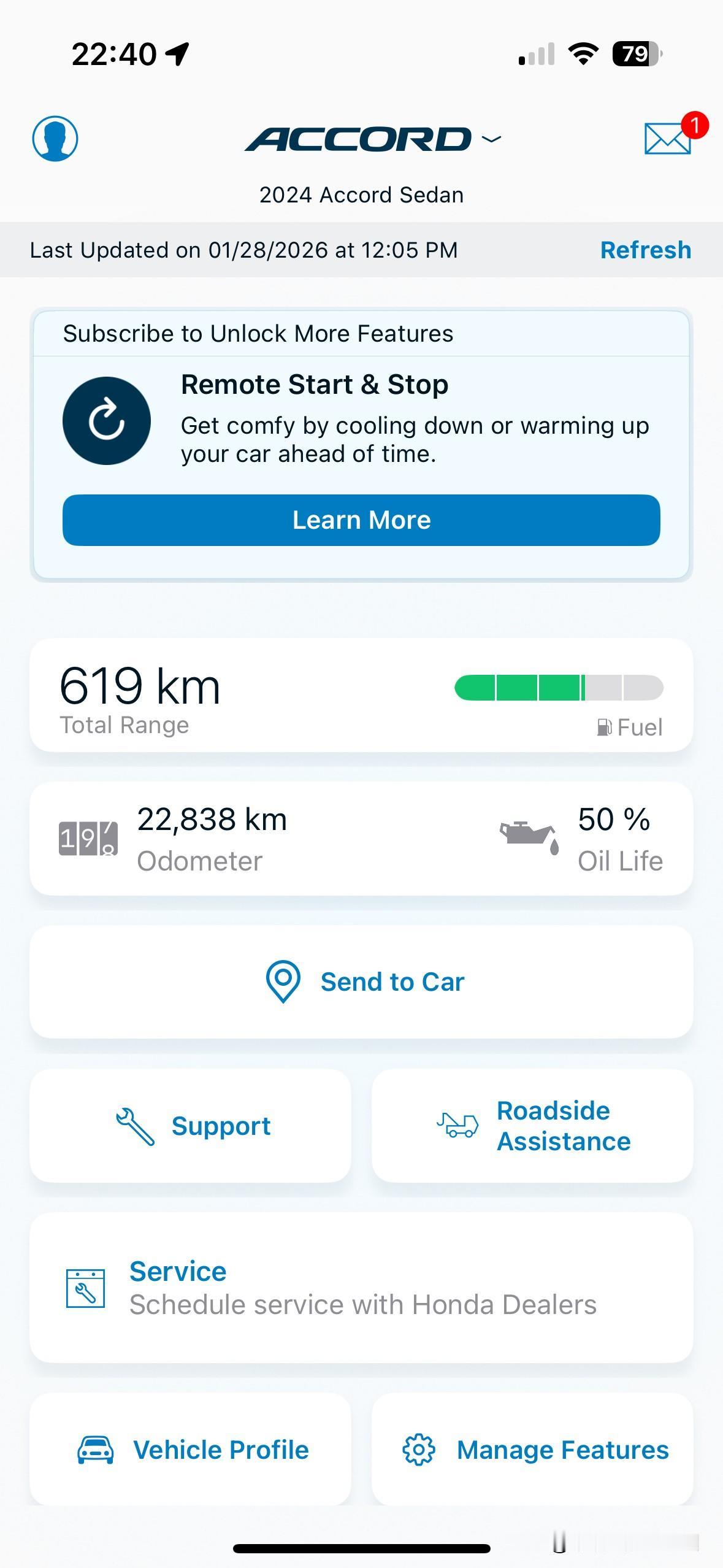 这是本田在美国市场的手车互联APP:HONDALINK,只给你免费开放的只有3个可有可无的行车数据(剩余续航、总里程、机油寿命),连手机远程开空调这种实用的入门功能则要花10美元/月订阅,如今这几个鸡肋免费功能也在3月5号之后关闭了,真是哭笑不得。