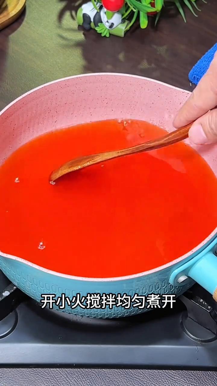·空锅倒入一包果冻粉、适量的白糖、煮好的火龙果汁倒进去,开小火搅拌均匀煮开就可以倒进杯子里。