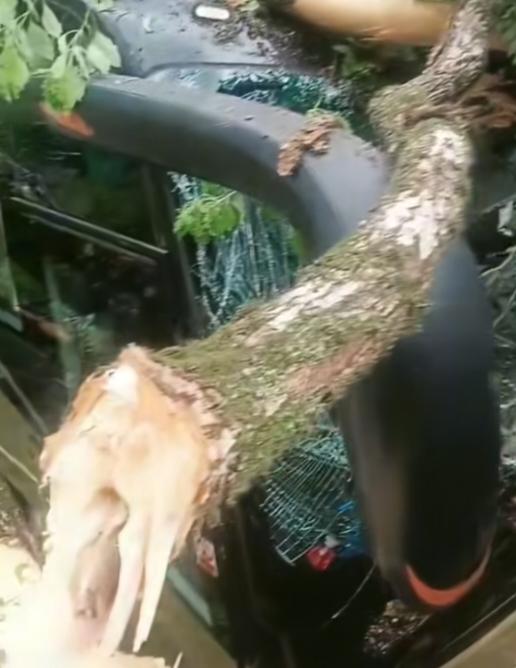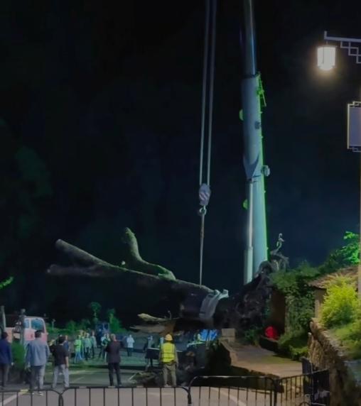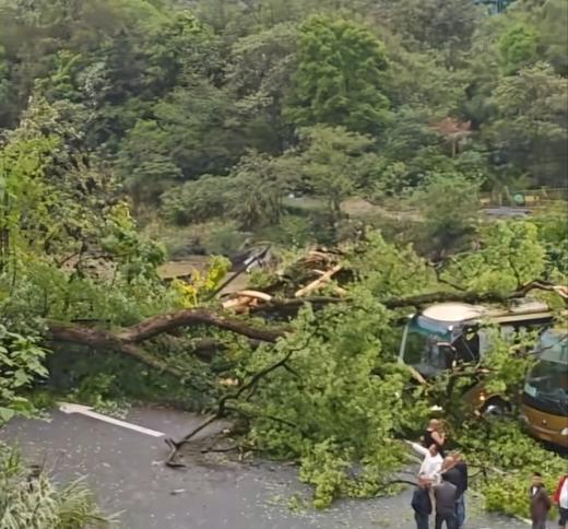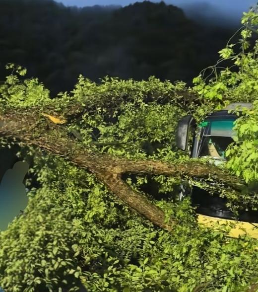 江西望仙谷,一棵百年老樟树被风吹倒,多辆大巴车被砸!