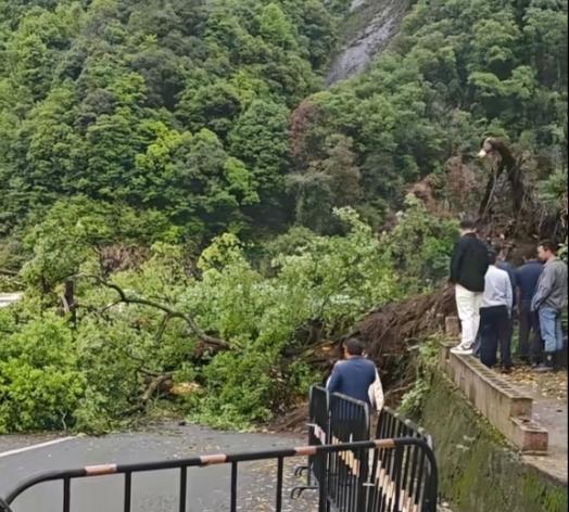 事发地点在望仙谷景区第一个进口,近期由于大雨倾盆,老樟树底部空了,正好景区刮很大的风,老树被大风刮倒,砸中了这里停放的多辆旅游大巴。
