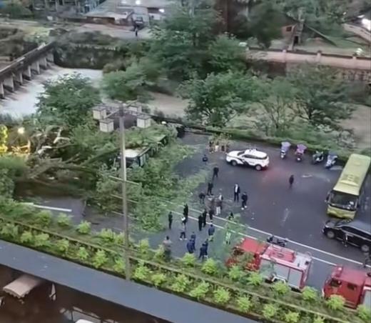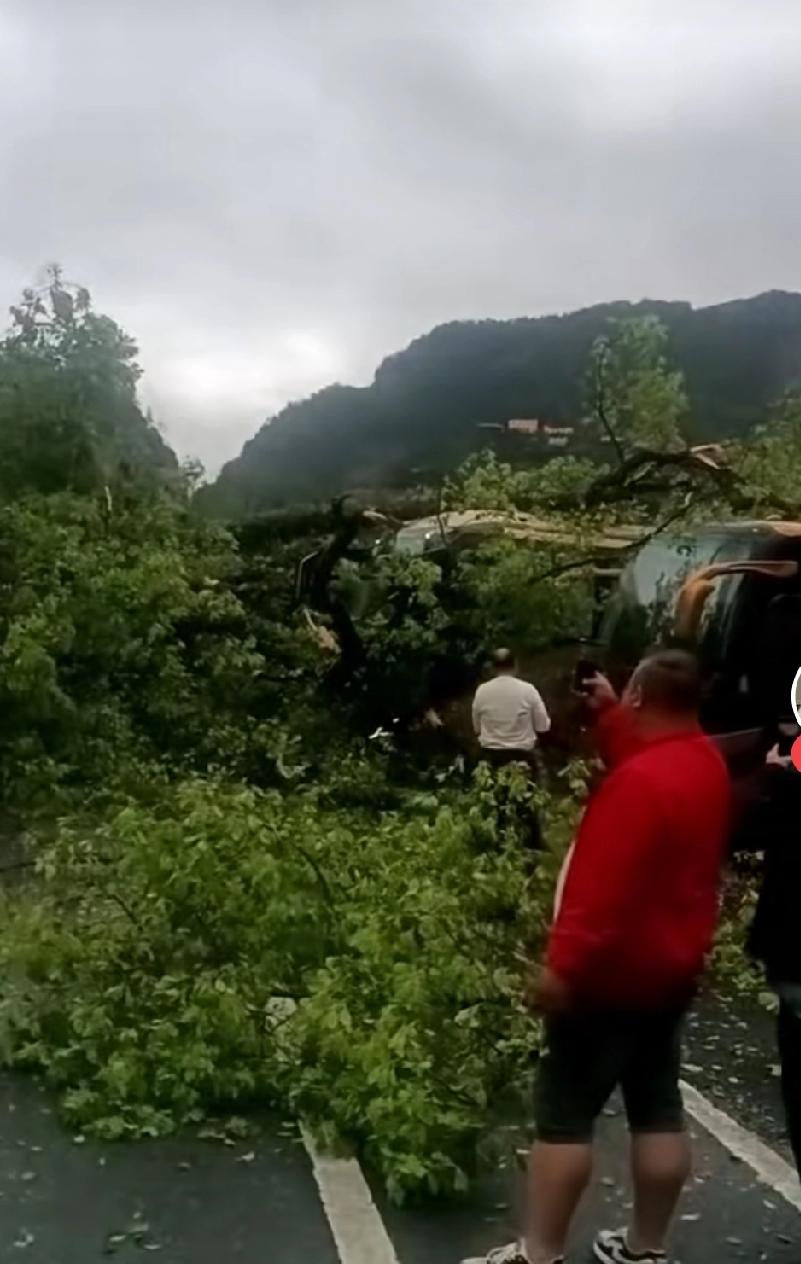 4月17日,江西上饶望仙谷景区,一棵几百年老樟树被吹倒,砸中多辆旅游大巴。