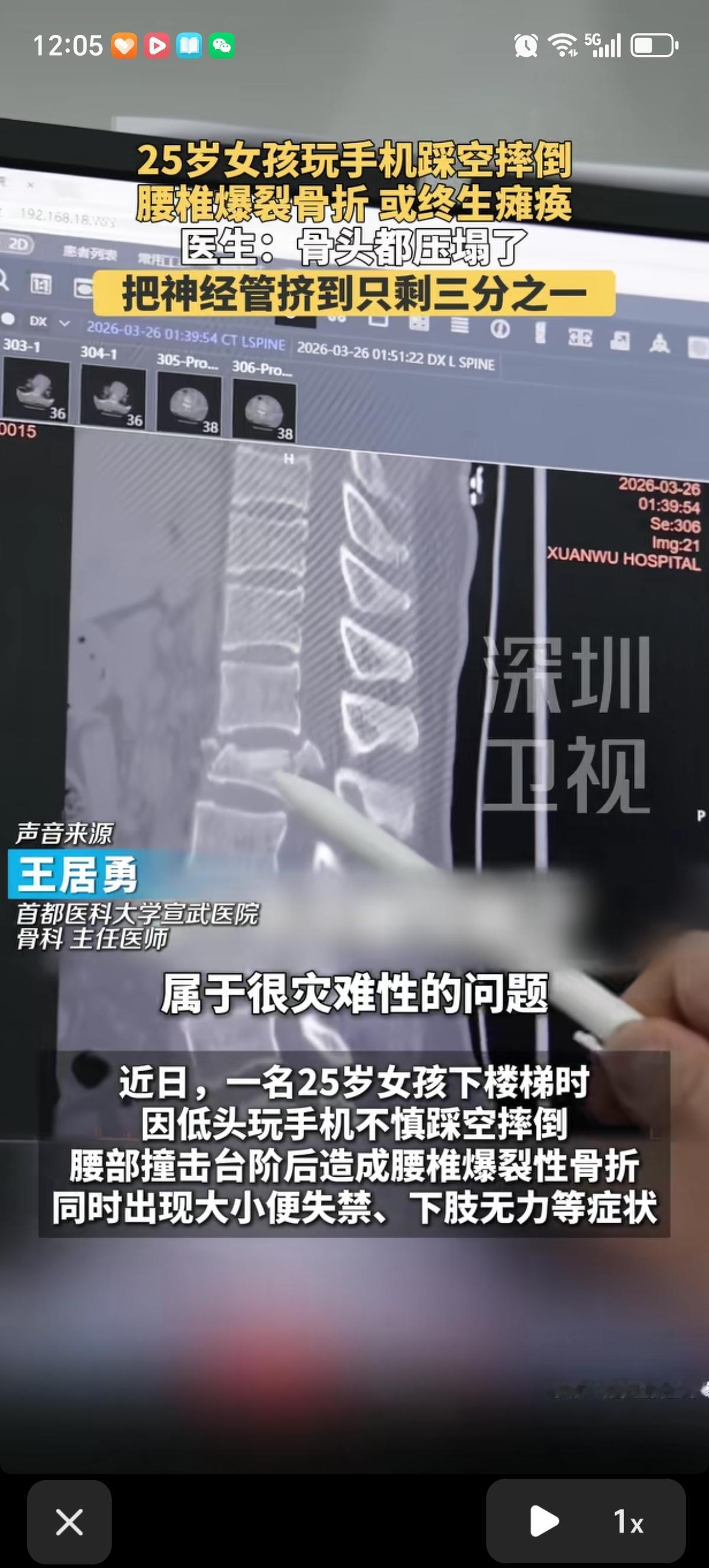 河南郑州一个25岁的女孩下楼梯时,边走路边低头玩手机,一脚踩空摔倒,腰部撞击台阶后造成了腰椎爆裂骨折,同时出现大小便失禁、下肢无力等症状。