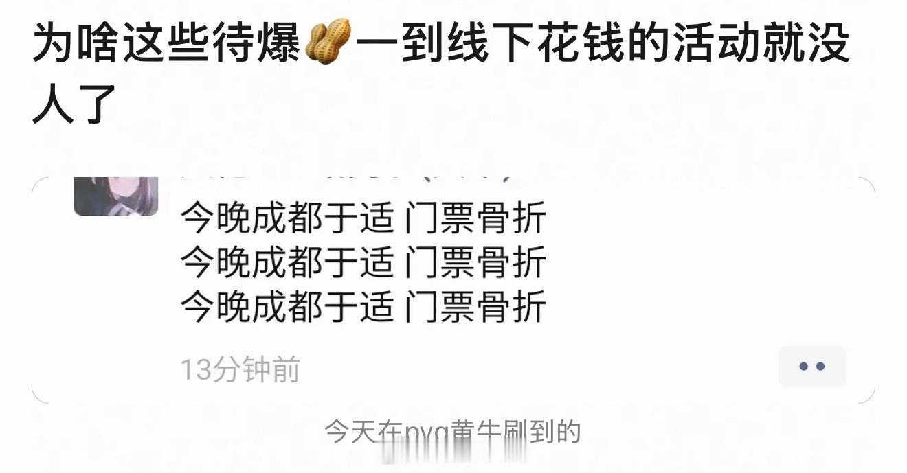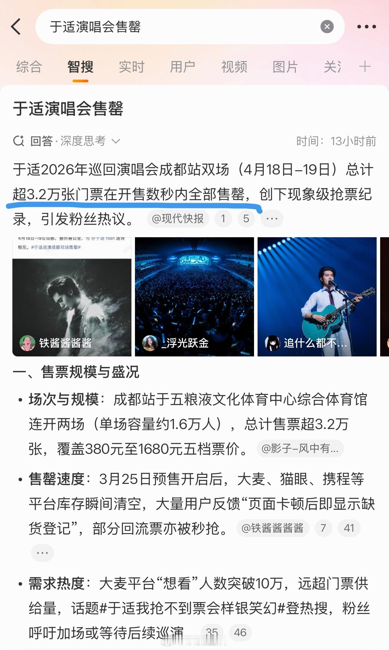 记得当时上的热搜说于适成都演唱会门票是售罄的,结果网友发现现在在打骨折。 这种虚假繁荣热度一过去💦之后才是真实现状。