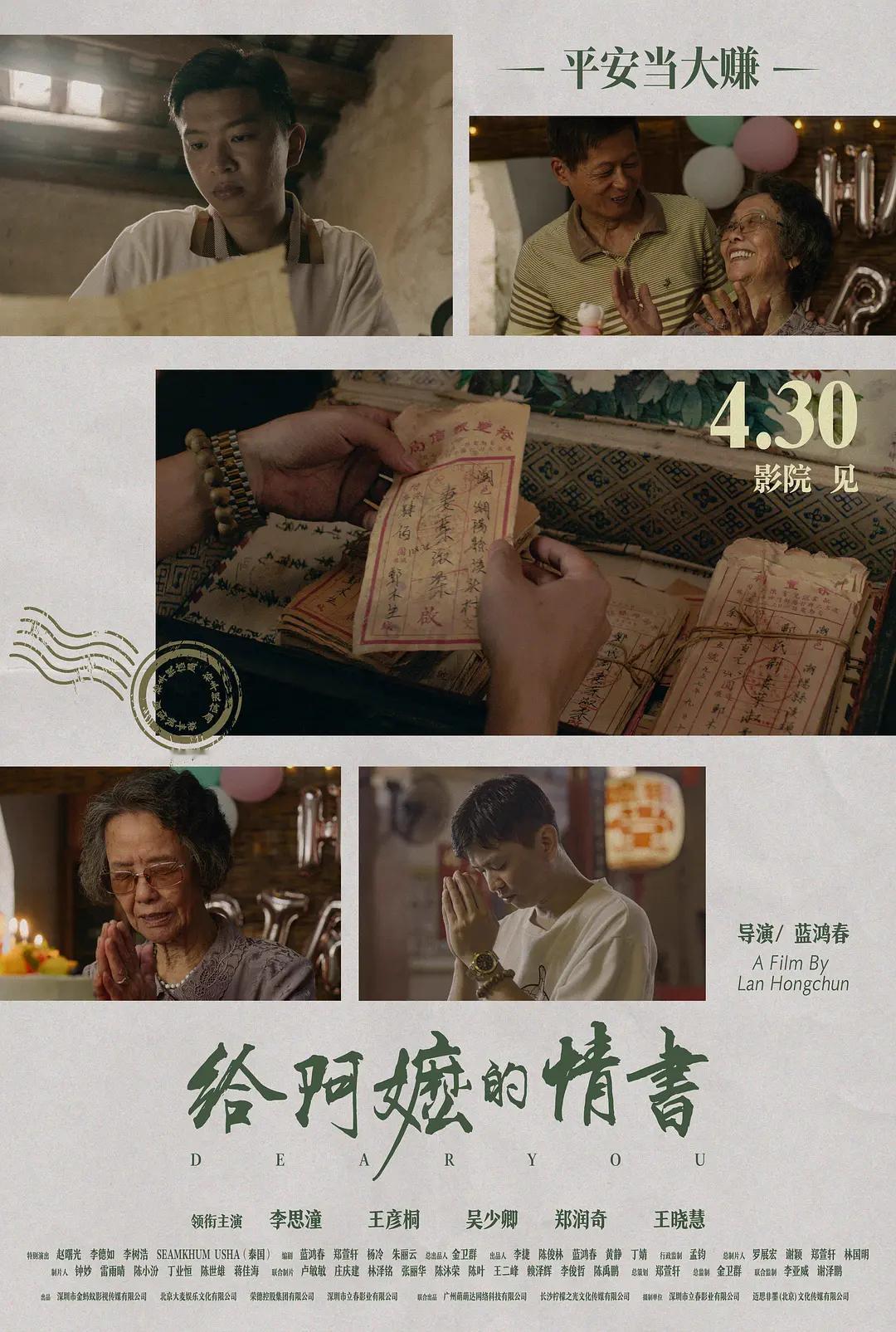 影讯 04.30给阿嬷的情书 影片信息(区域发行,14点上片)国 别:中国类 型:剧情、喜剧、爱情、家庭片 长:118分钟幕 幅:遮幅声 制:5.1语 别:普通话、潮汕话发行版本:数字2D发行范围:北京市、上海市、⼴东省、⼴西壮族⾃治区、海南省、福建省放映期限:2026年04月30日 14:00- 2026年05月30日