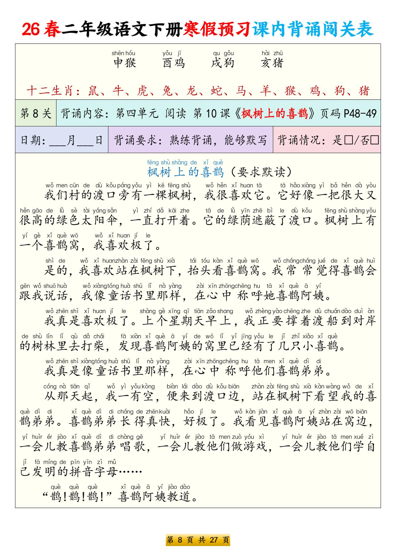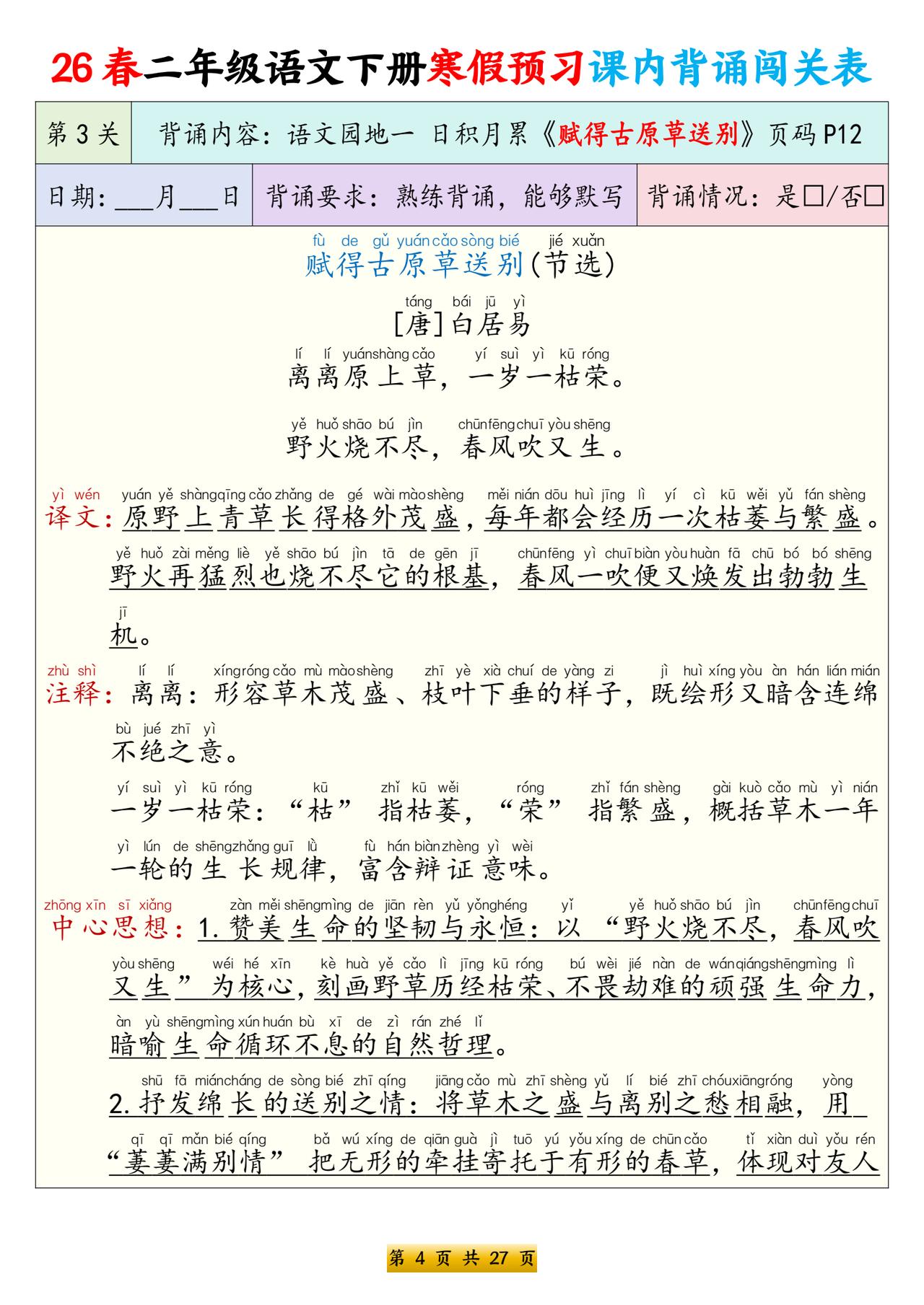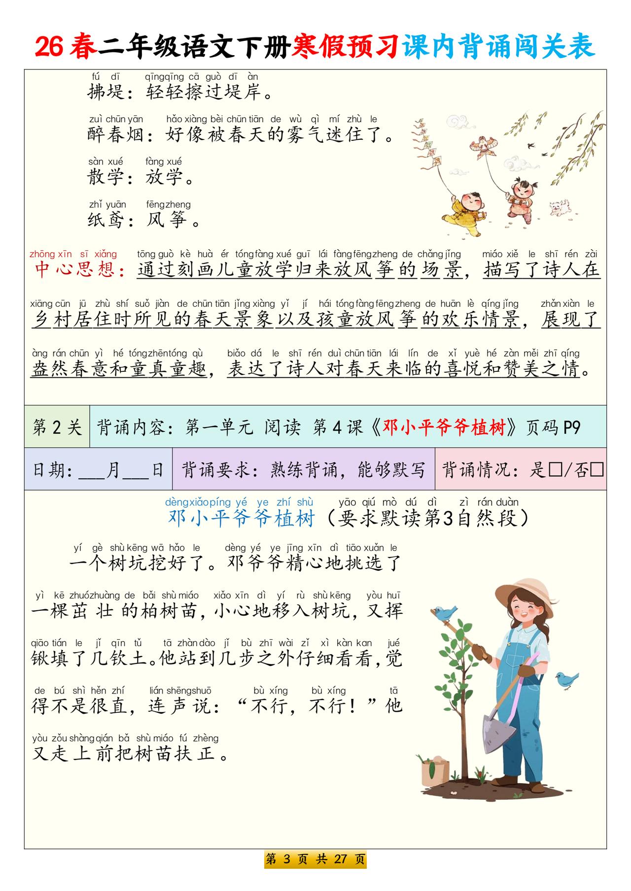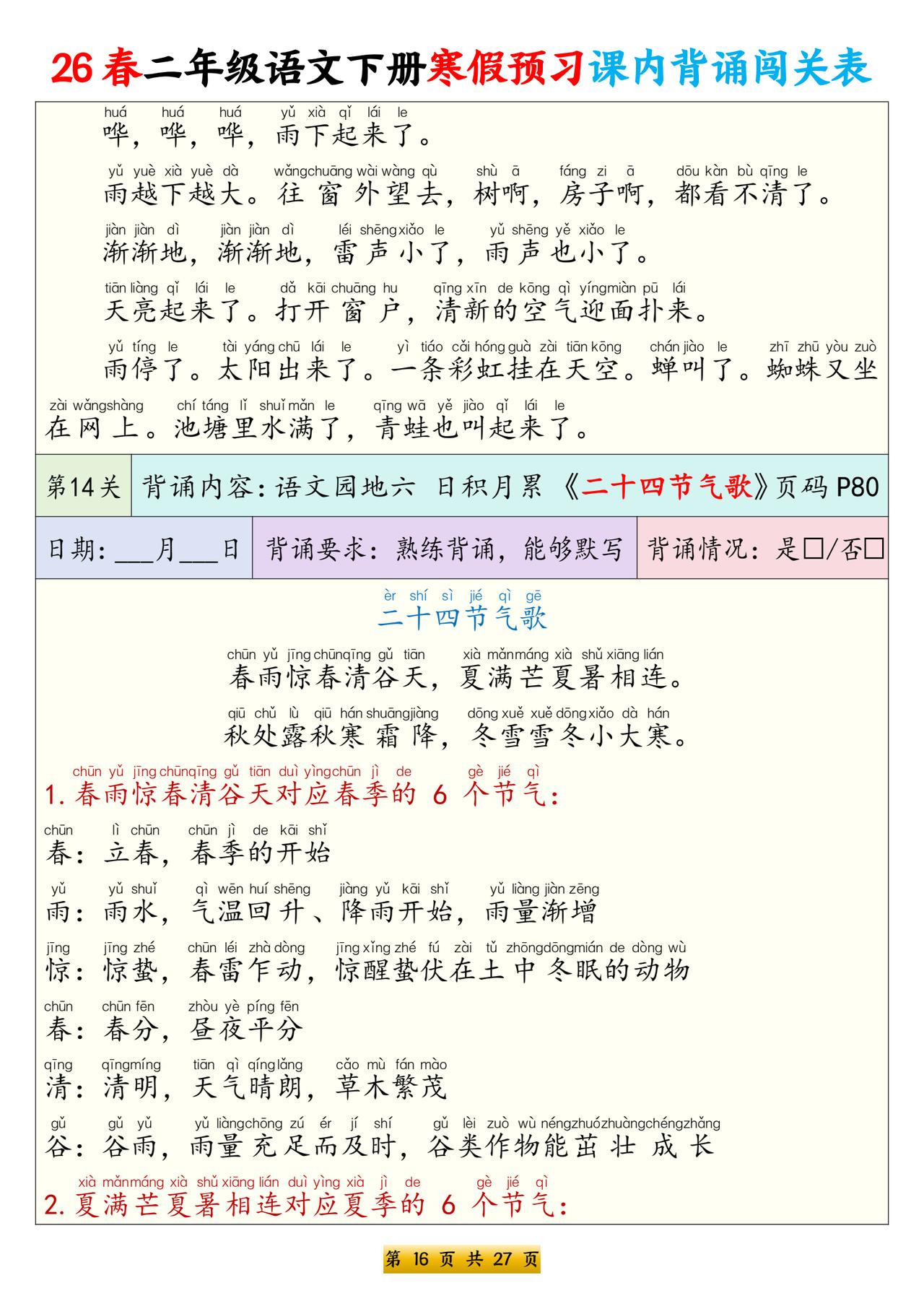 26春二年级下册语文课内背诵表(拼音版)27页,收藏备用