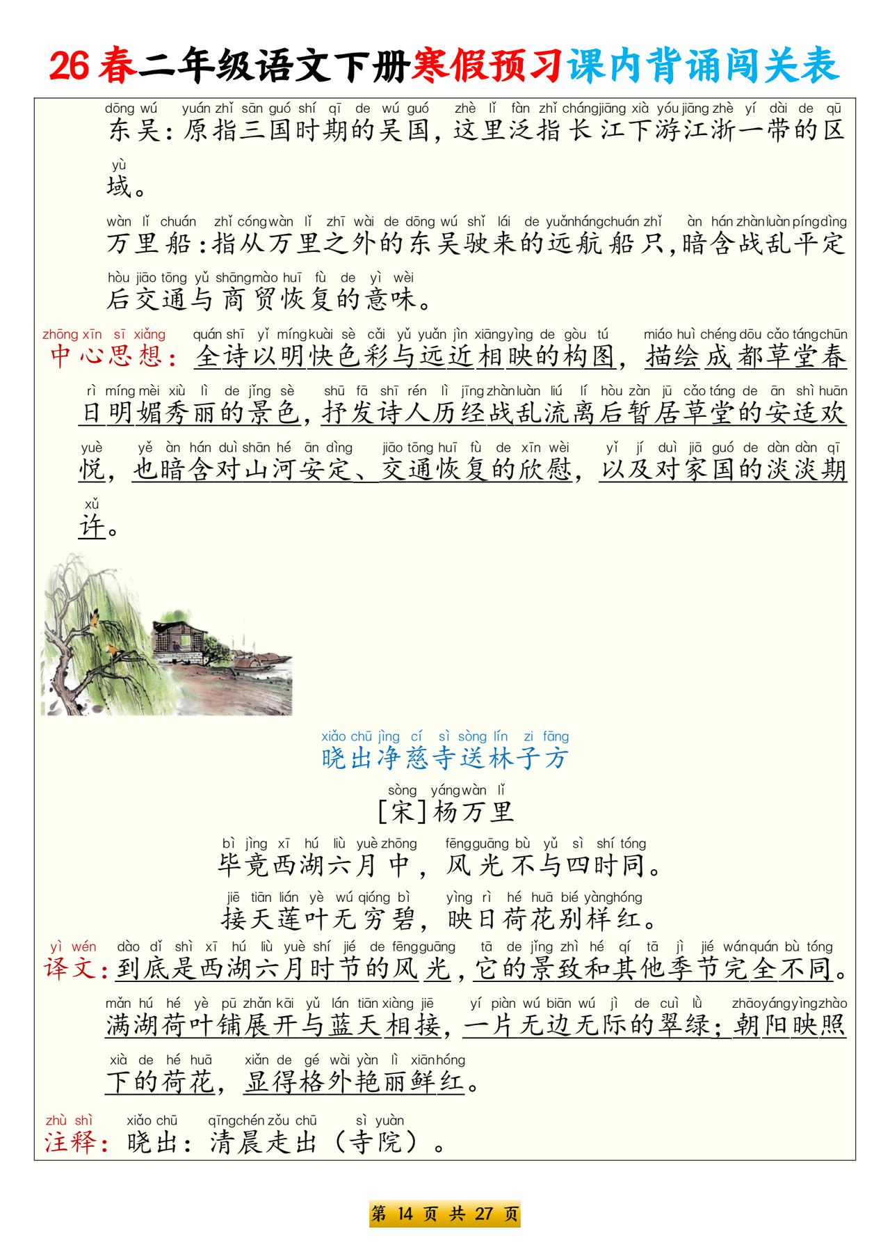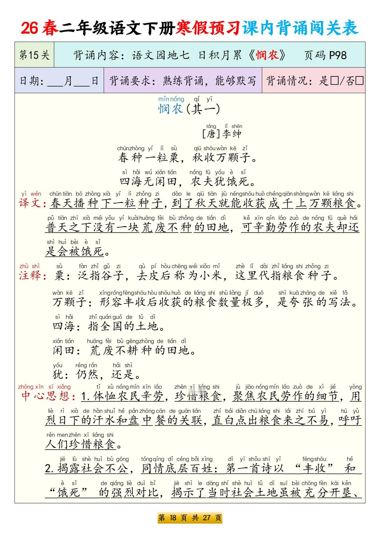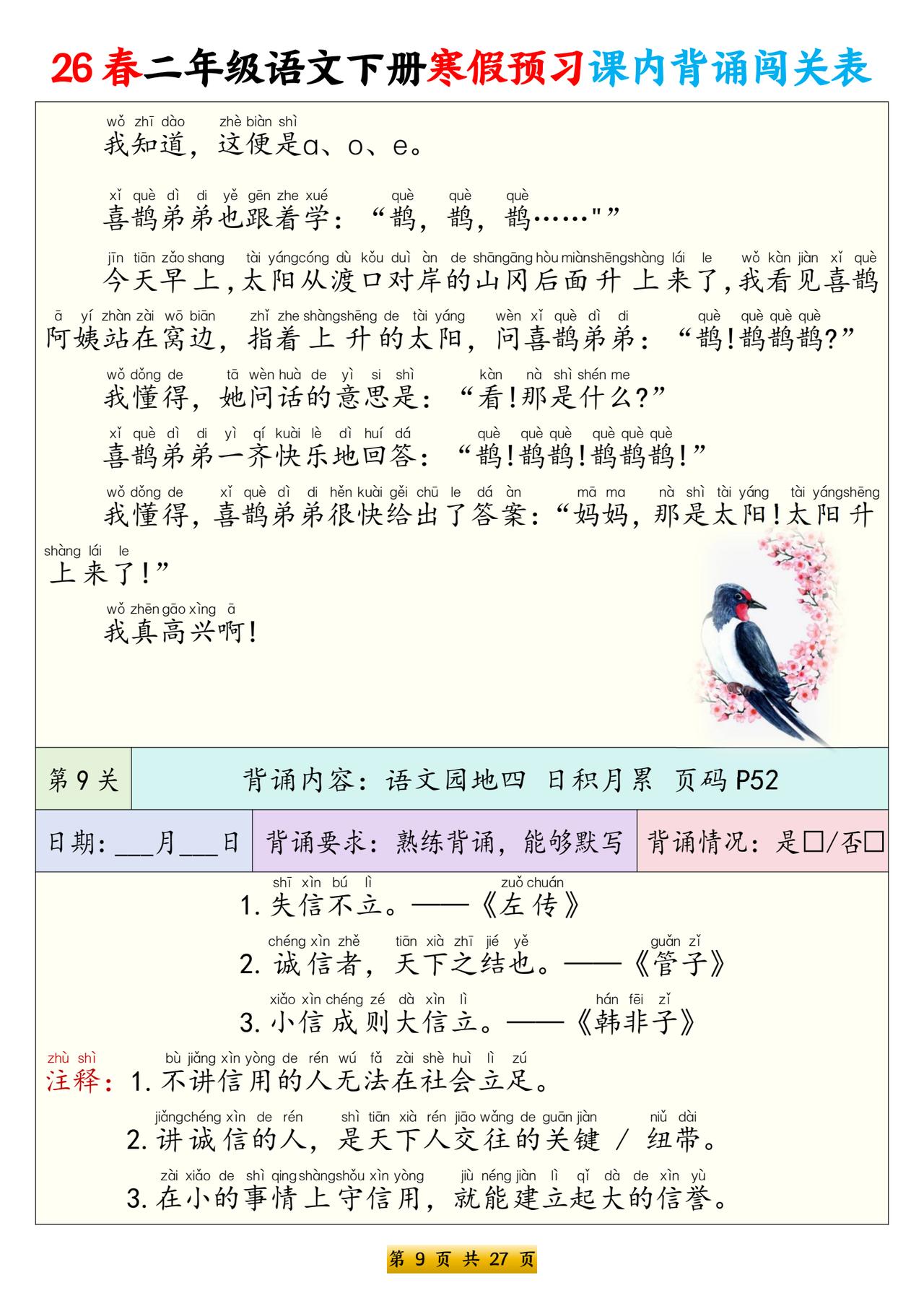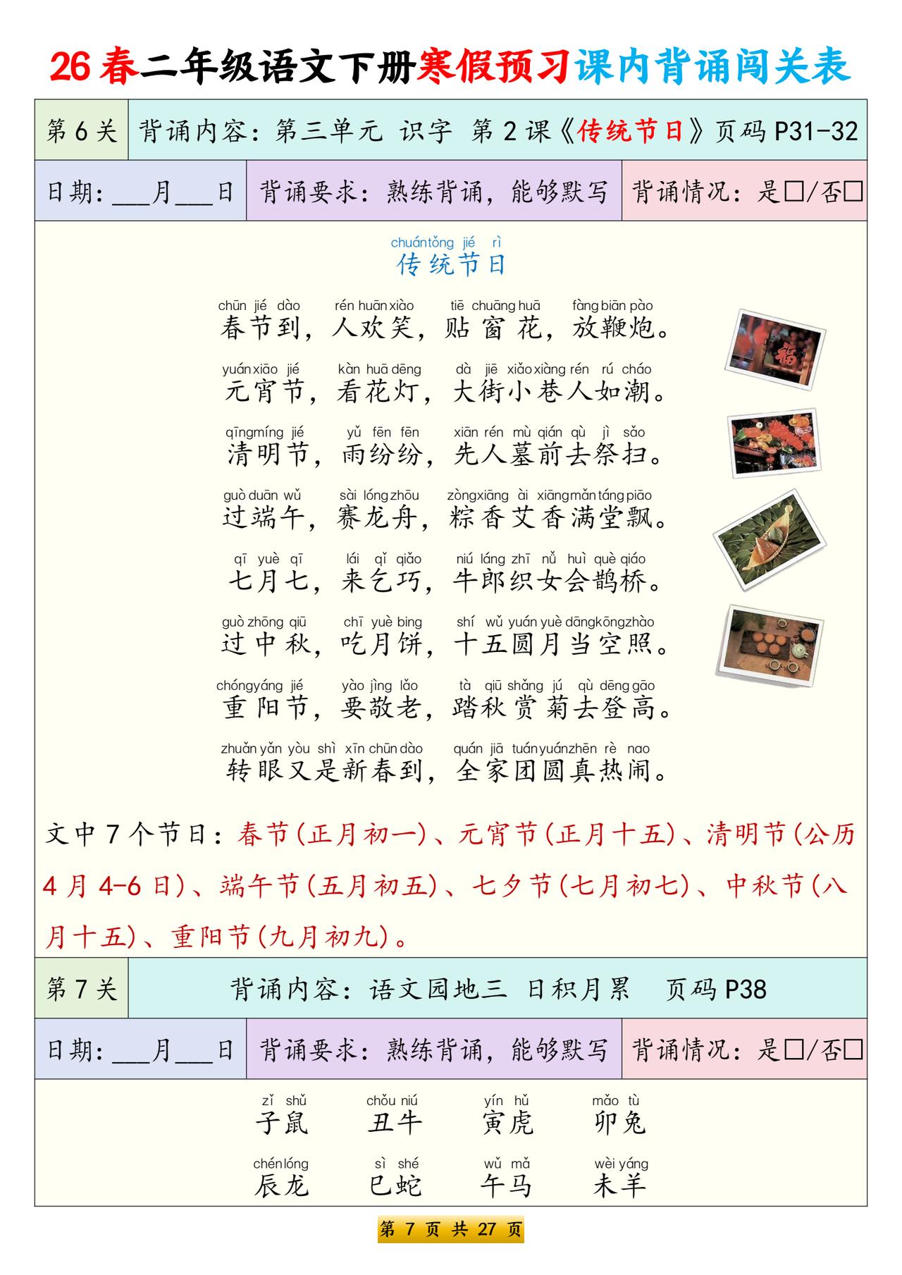 26春二年级下册语文课内背诵表(拼音版)27页,收藏备用