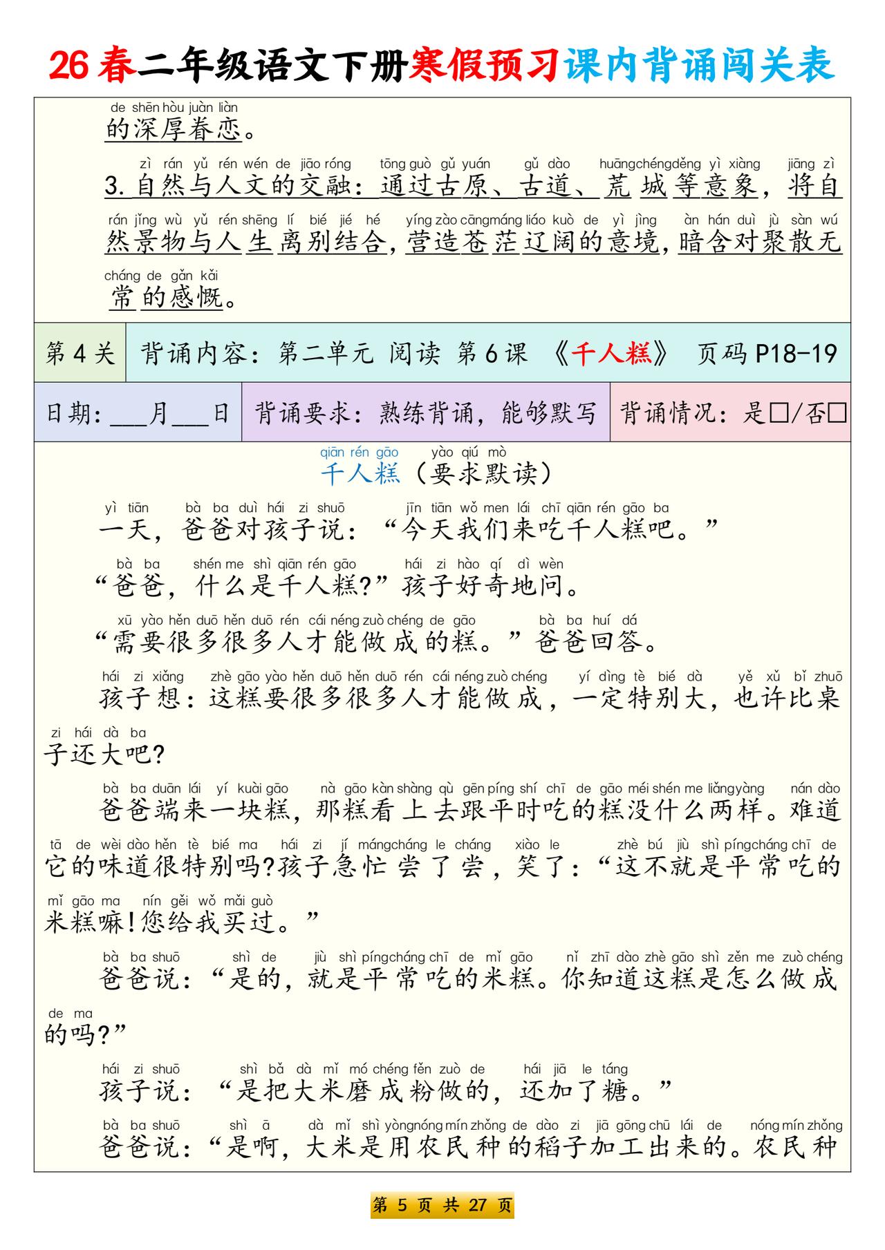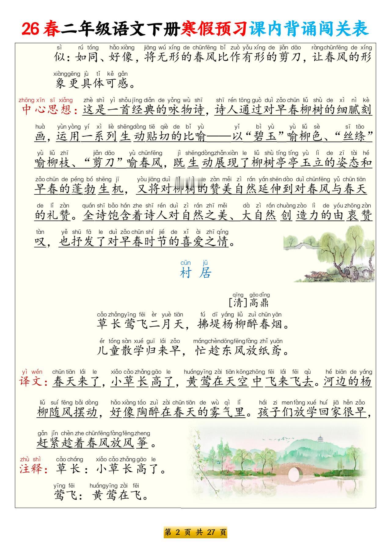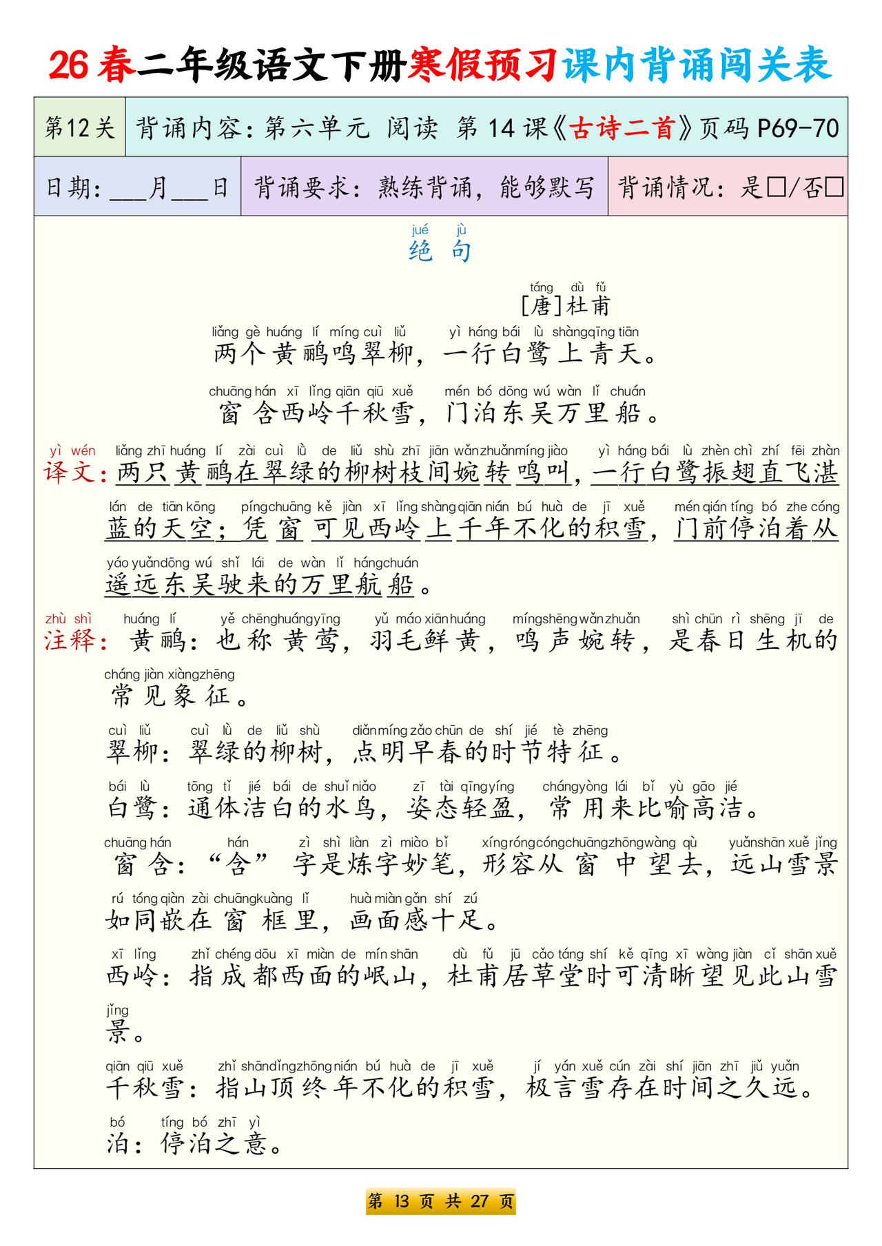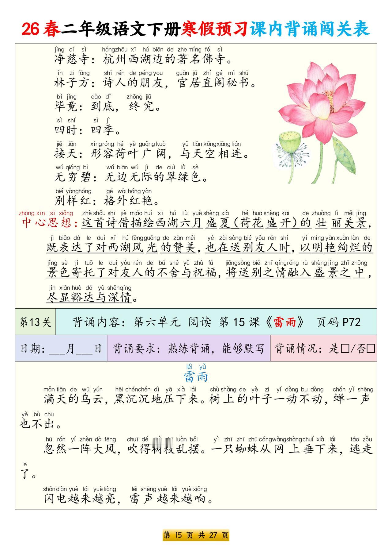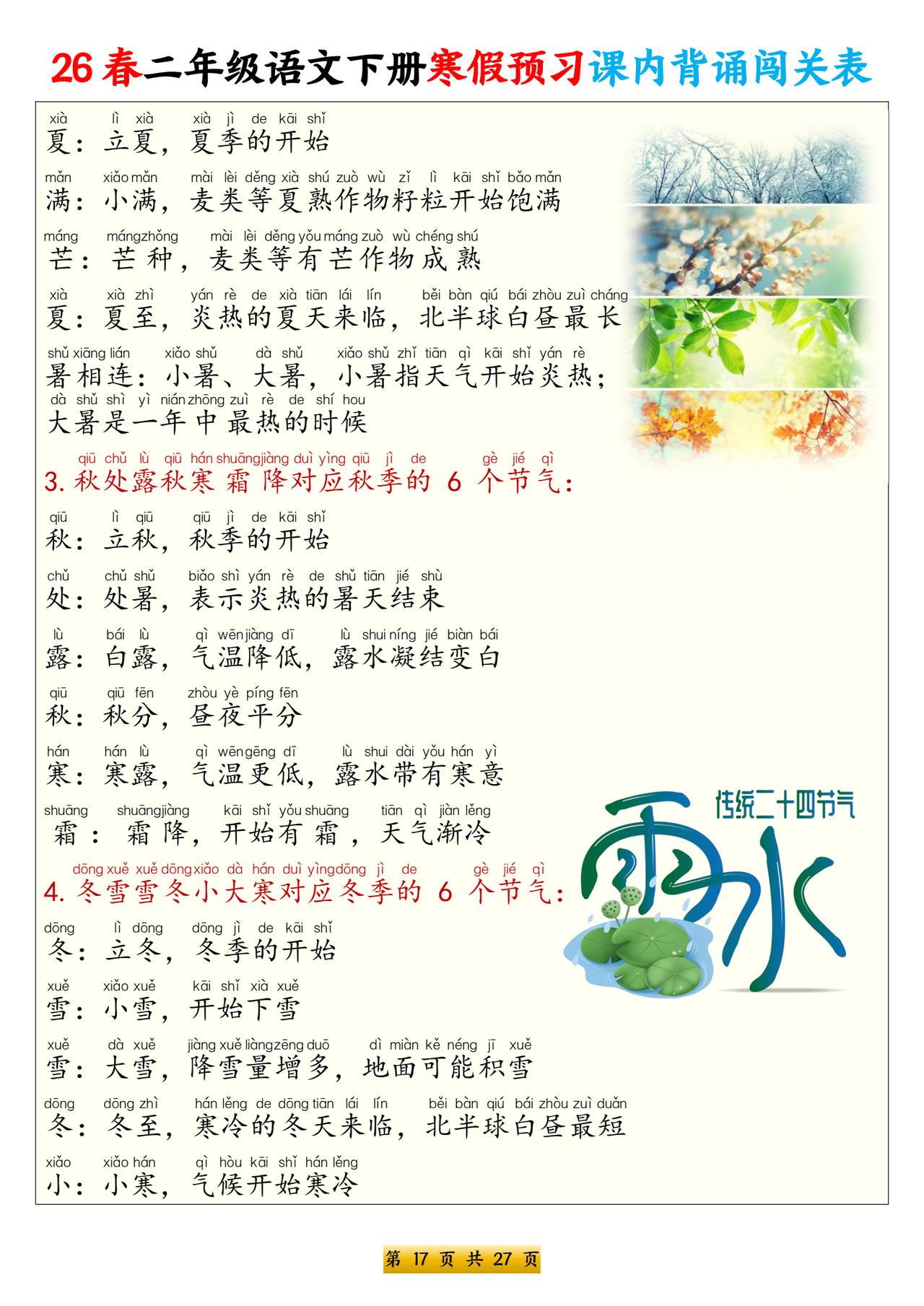 26春二年级下册语文课内背诵表(拼音版)27页,收藏备用