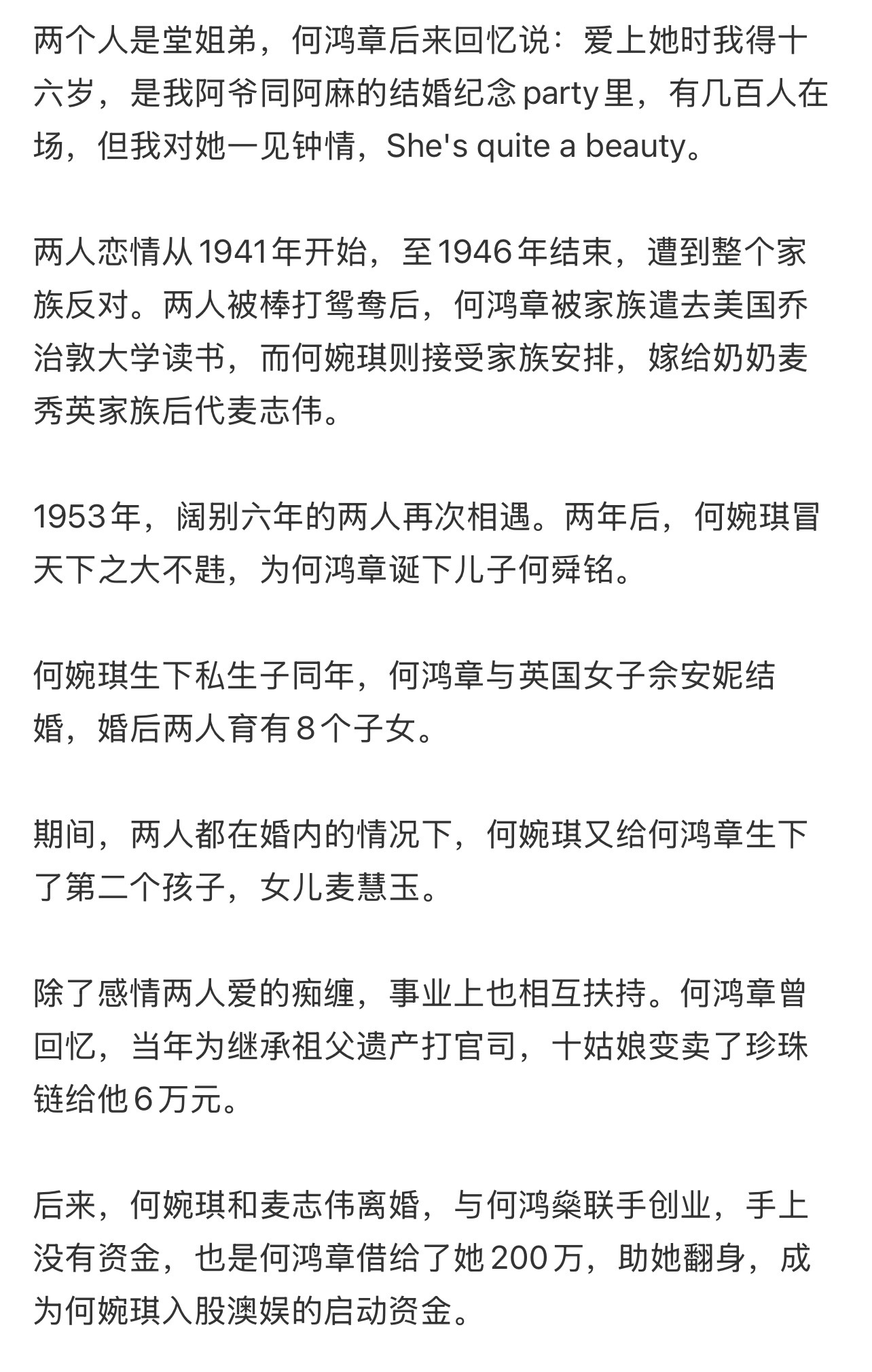 刚发现吴慷仁和廖子妤在寒战1994里演的是一对没有血缘的姑侄,原本以为平平无奇的骨科罢了,稍微一查发现居然是有原型的,赌王家族的何鸿章与何婉琪。堂姐弟少年相爱,被整个家族棒打鸳鸯,关键是后面的剧情,堂姐在婚内给堂弟生下一子一女(她老公真是顶级的龟公……),事业上还相互扶持,这是个什么剧情……骨科+背德+生子+事业大女主,谁敢拍……