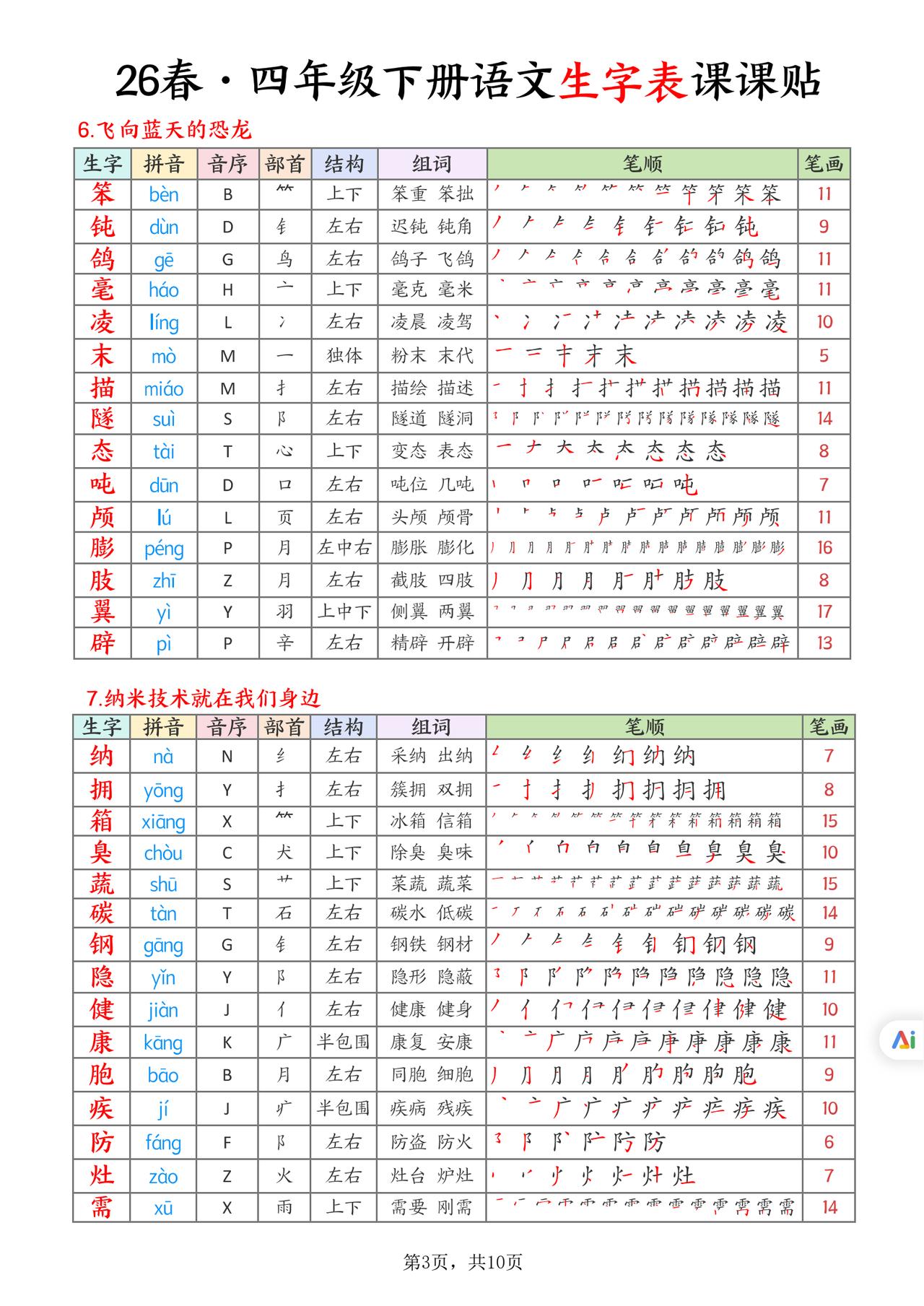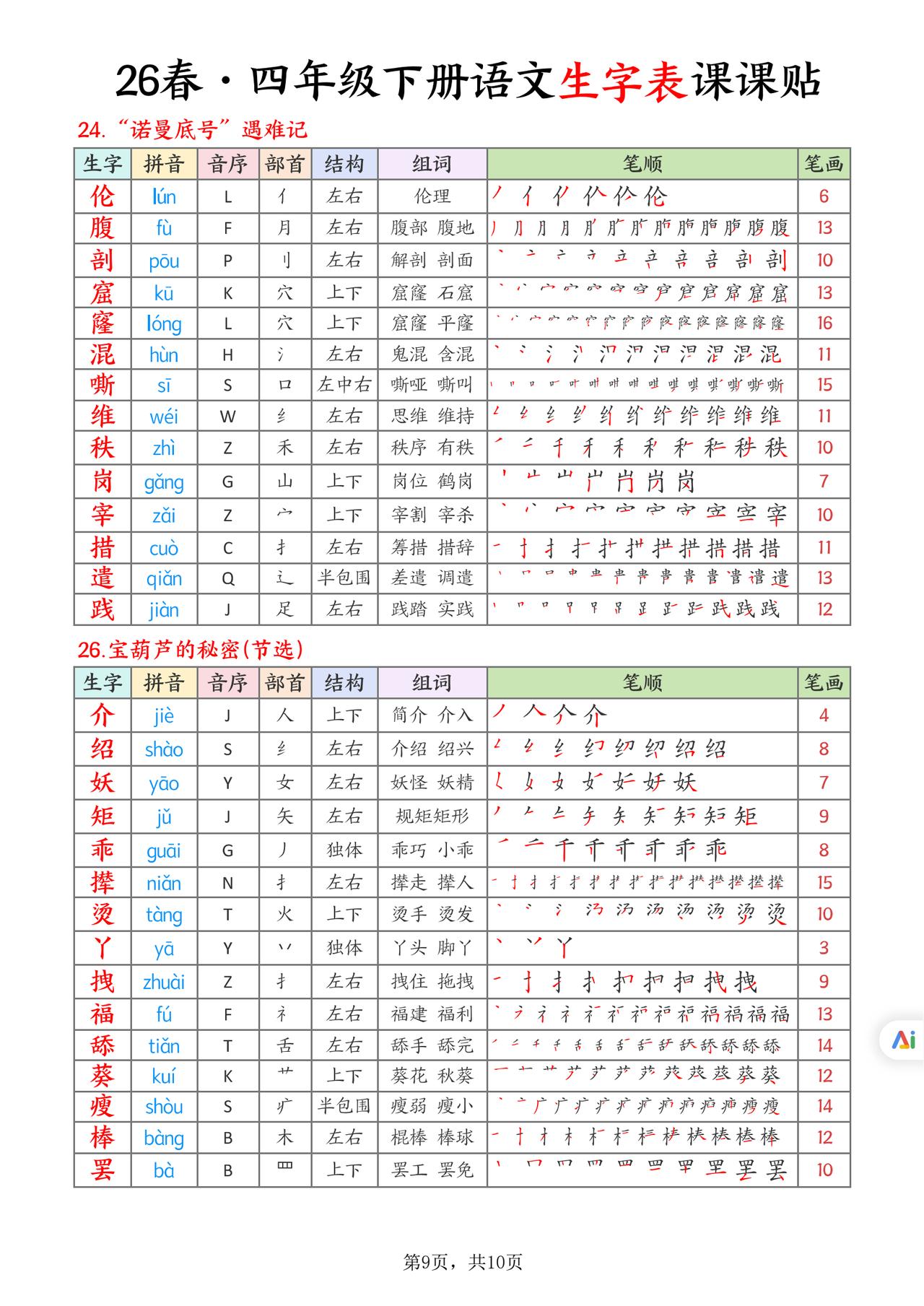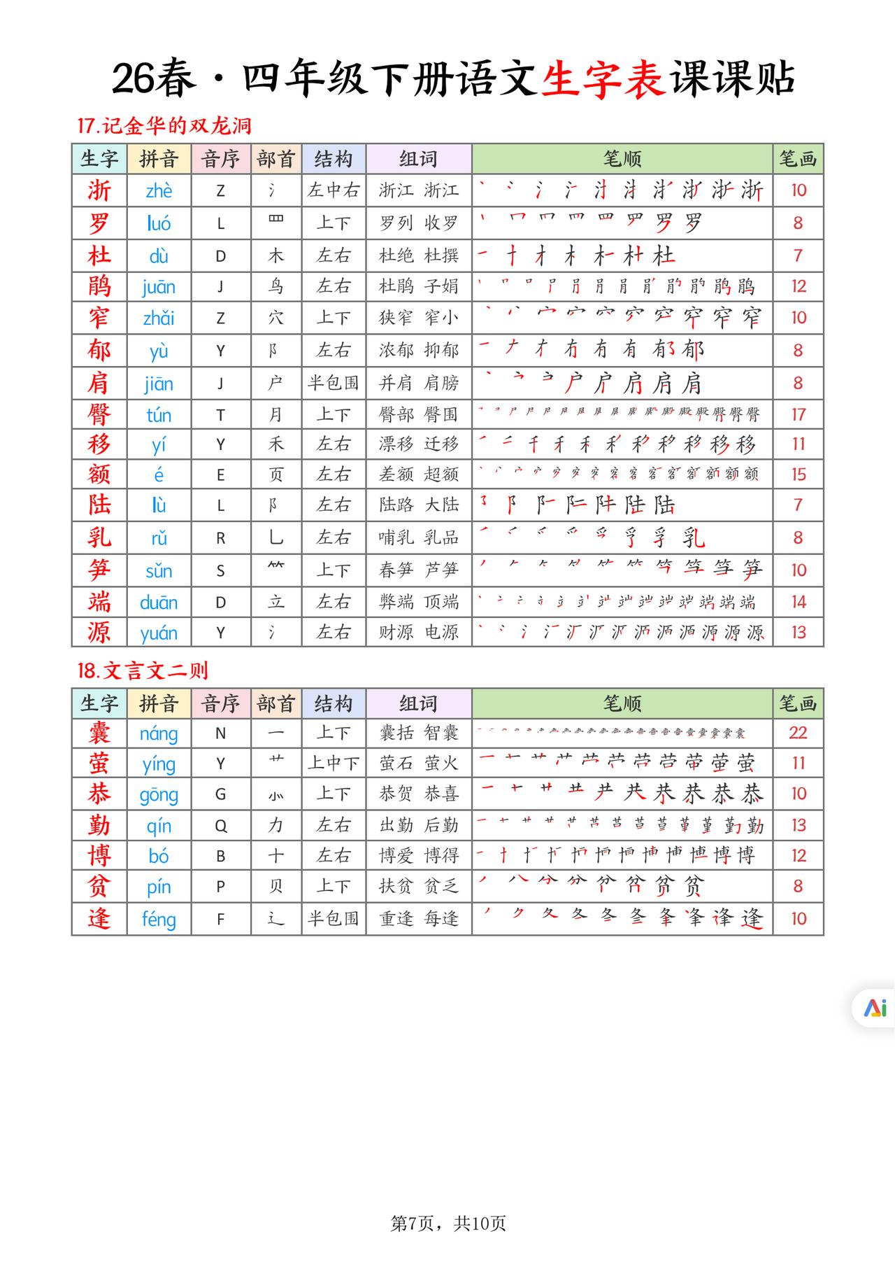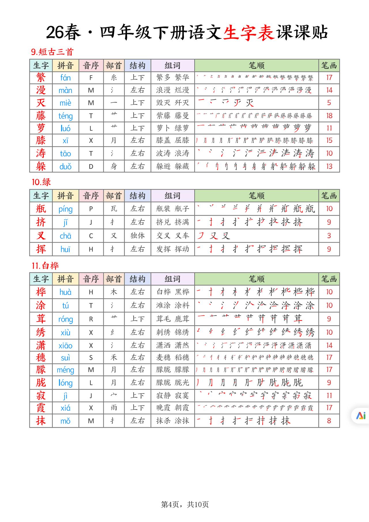 26春四年级下册语文,生字表课课贴10页,收藏备用